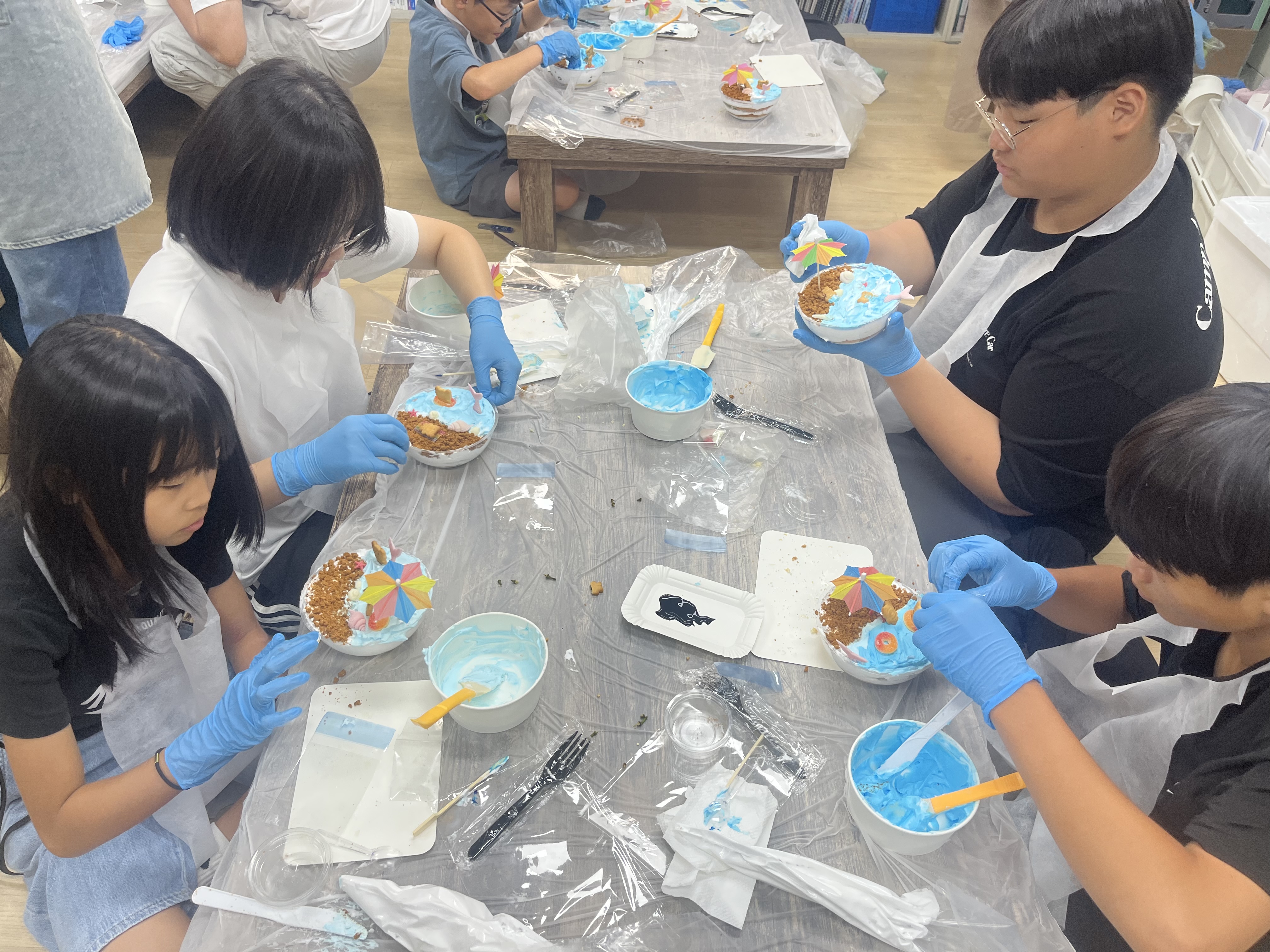 이번 체험에서는 아이들이 직접 생크림, 쿠키, 빵을 활용해 해변 느낌이 나는 케이크를 만들었습니다.