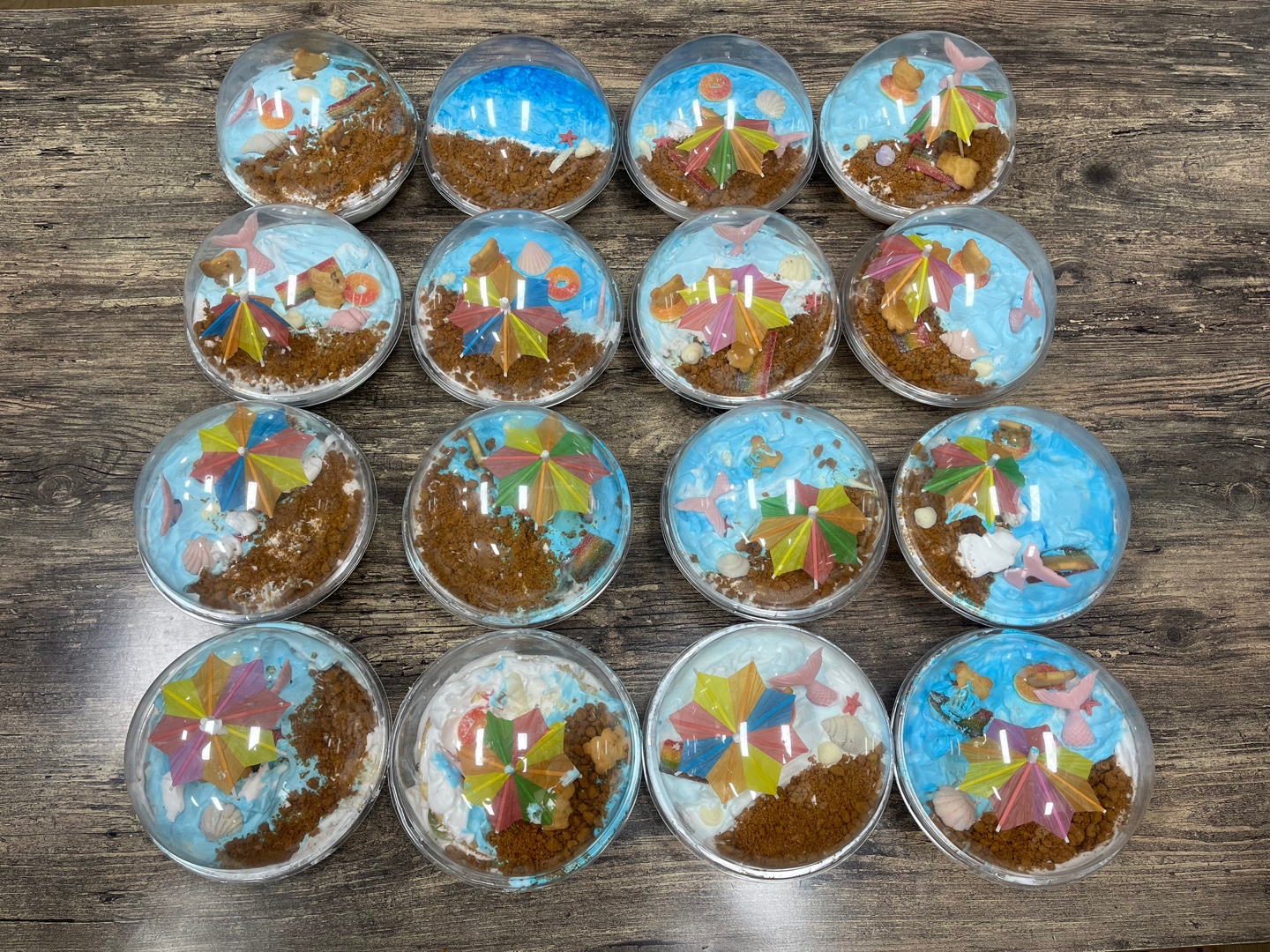 이후 푸른색 색소를 섞은 생크림을 만들어 케이크의 절반에 펴발라주어 바다를 표현했고, 나머지 절반에는 초콜렛 쿠키 가루를 뿌려 모래시장을 표현했습니다.