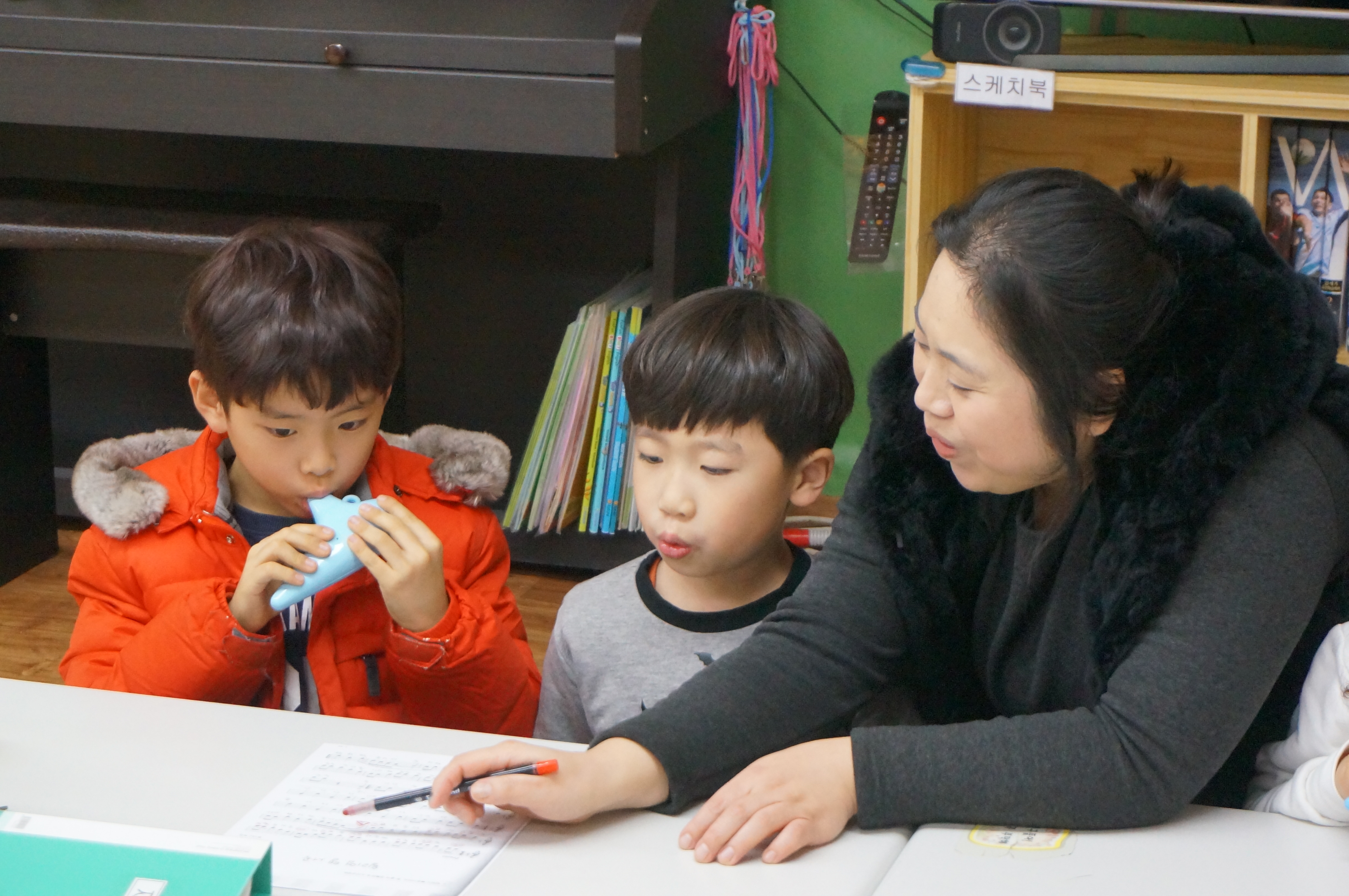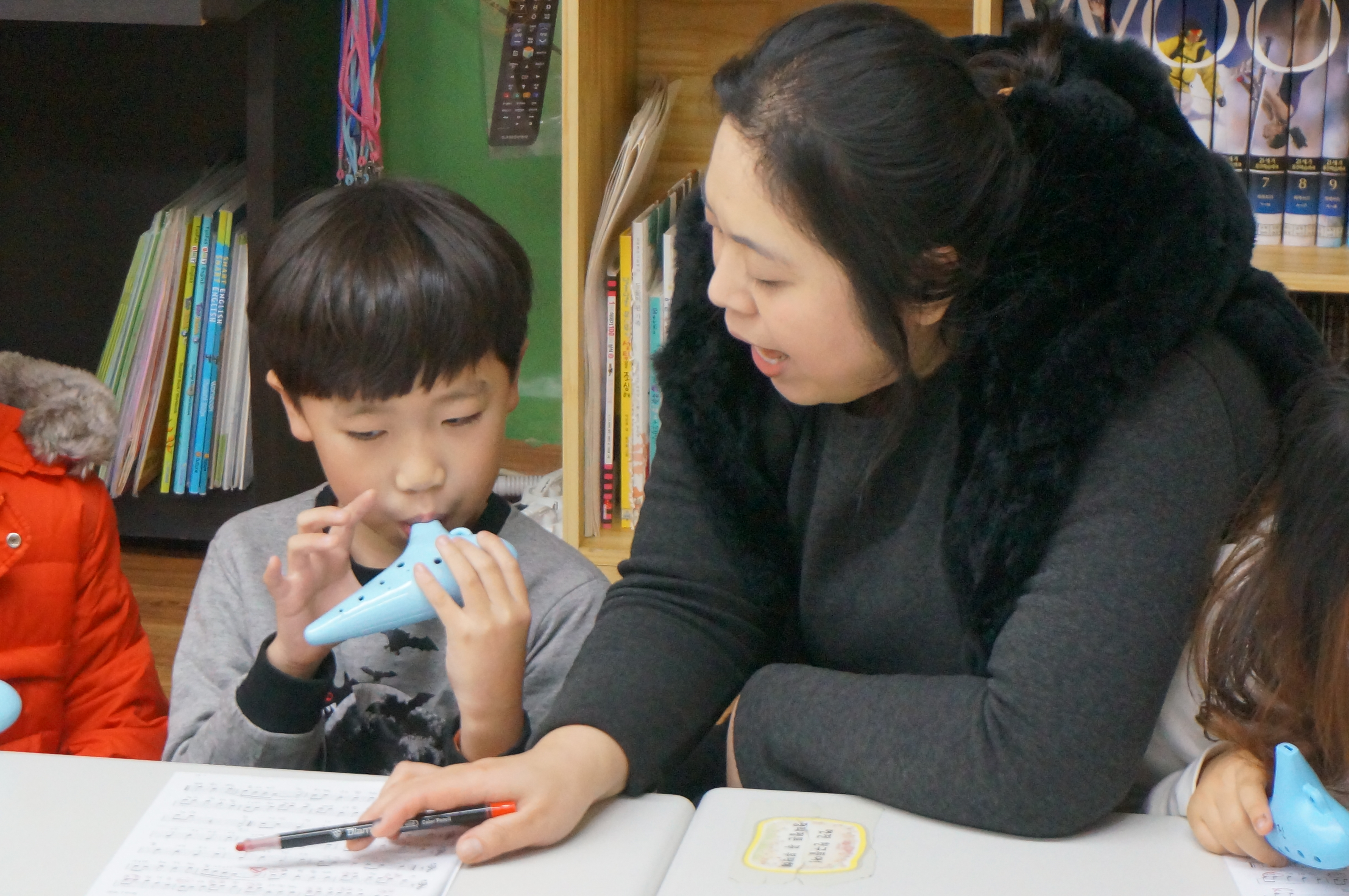 아동들의 1인 1악기 연주를 위해 오카리나 수업 진행