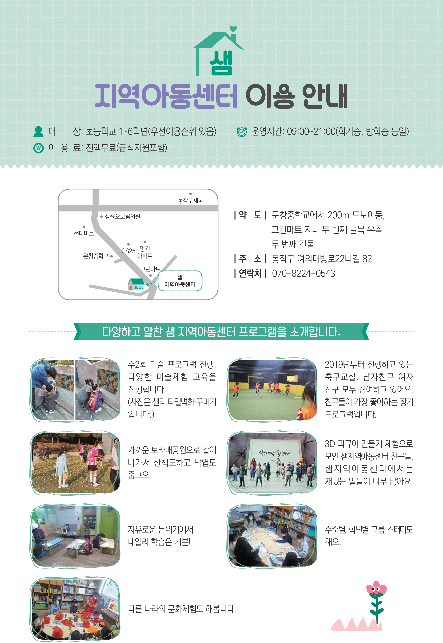 샘지역아동센터 | 서울특별시 동작구 여의대방로22나길 82 신대방동 [지도보기] Tel : 070-8224-0543 Fax : 02-821-0541 E-mail : man2002@naver.com