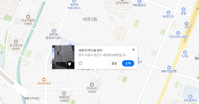 세류지역아동센터 | 경기도 수원시 권선구 세권로 108번길 33-4 (세류동) 2층 [지도보기] Tel : 031-232-3019 Fax : 031-237-3020 E-mail : seryu3020@naver.com