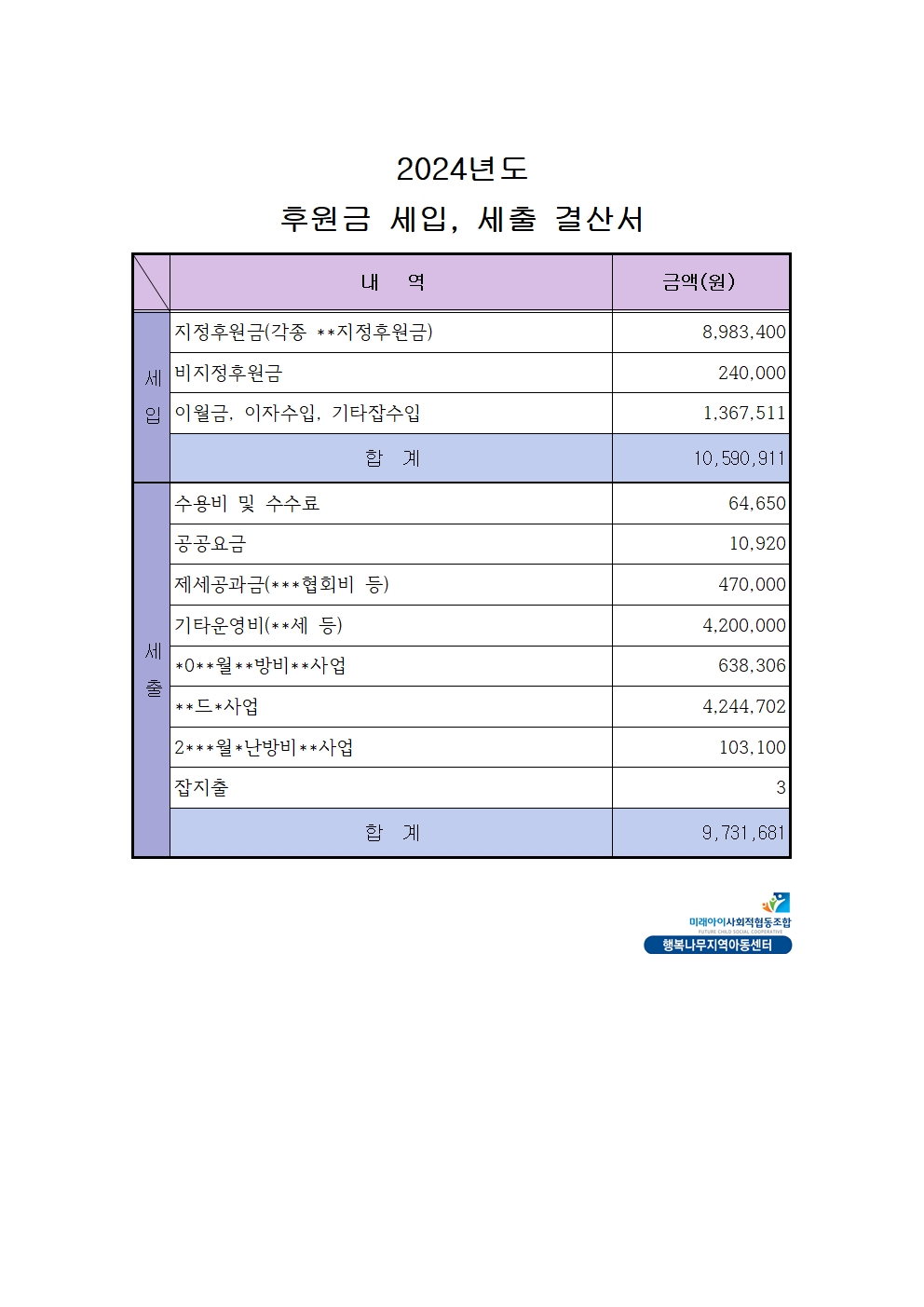 사회복지법인 및 사회복지시설 재무회계 규칙 제 10조(예산의 편성 및 경정절차), 동 규칙 제 19조(결산서에 작성제출), 동 규칙 제 20조(결산보고서에 첨부하여야 할 서류) 및 동 규칙 제 41조 6 (후원금에 수입, 사용결과보고서 및 공개) 규제에 의거하여 2022년 결산보고 및 후원금품 수입, 사용내역을 공지 합니다.