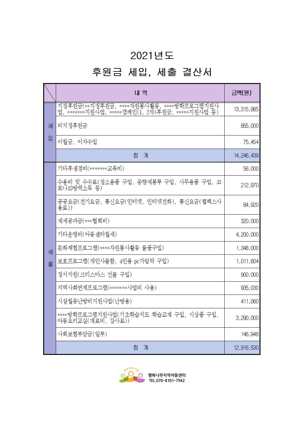 사회복지법인 및 사회복지시설 재무회계 규칙 제 10조(예산의 편성 및 경정절차), 동 규칙 제 19조(결산서에 작성제출), 동 규칙 제 20조(결산보고서에 첨부하여야 할 서류) 및 동 규칙 제 41조 6 (후원금에 수입, 사용결과보고서 및 공개) 규제에 의거하여 2021년 결산보고 및 후원금품 수입, 사용내역을 공지 합니다.