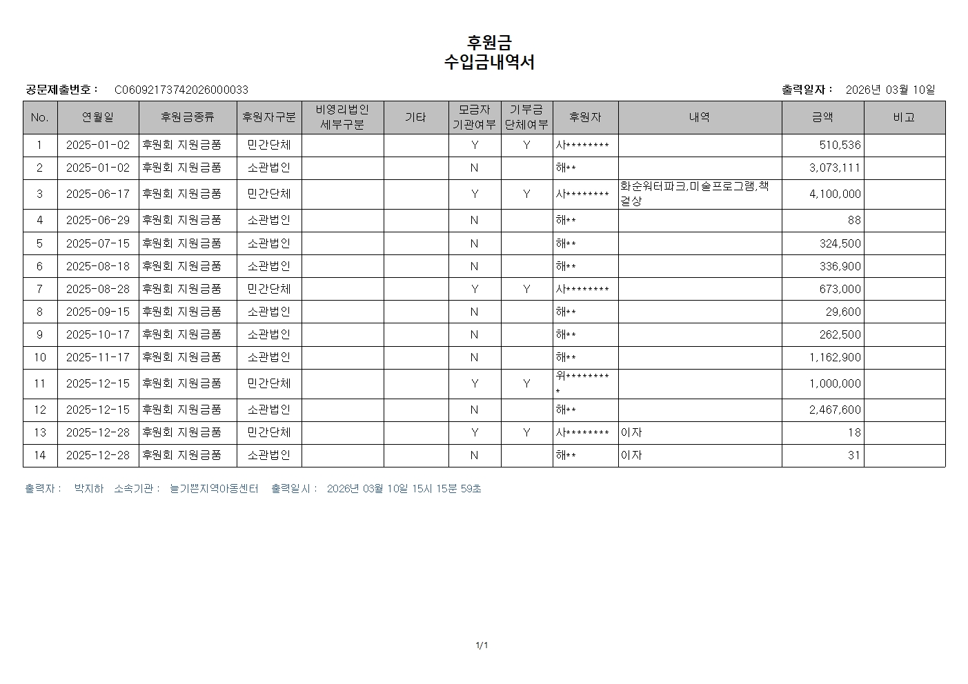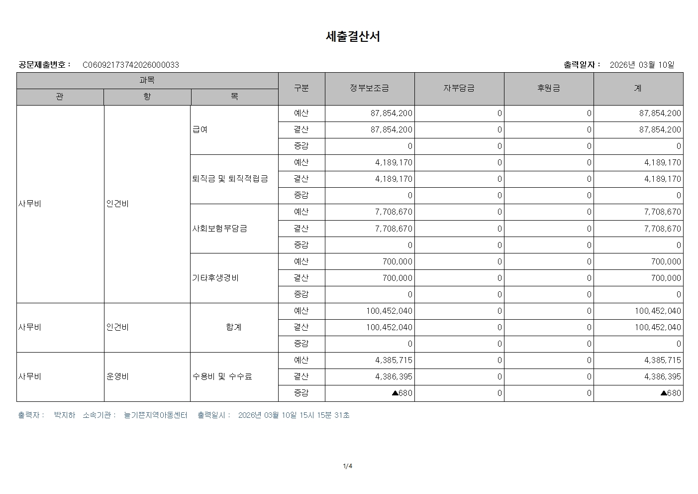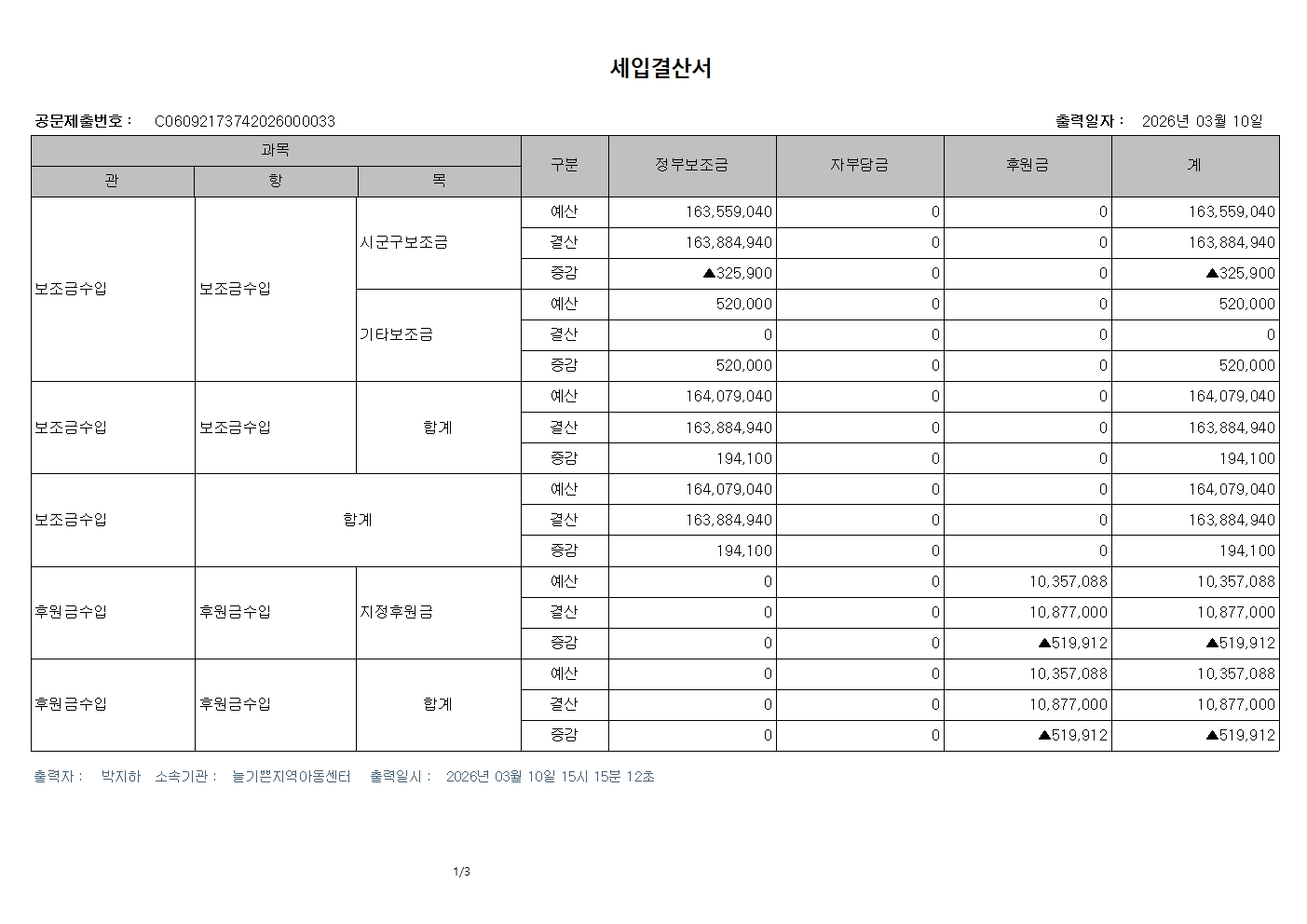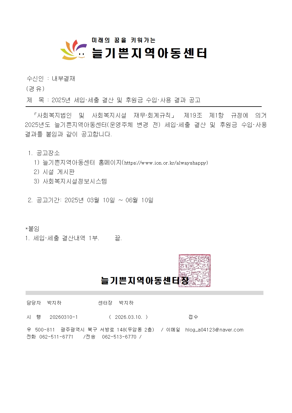 2025년 세입,세출 결산 및 후원금 수입,사용 결과 공고