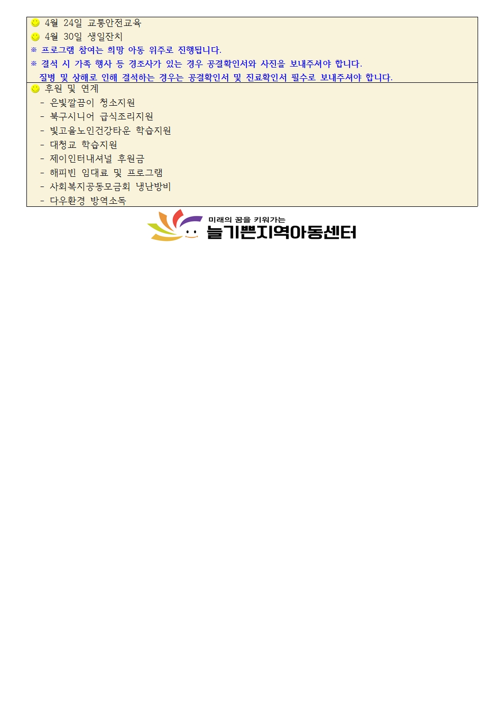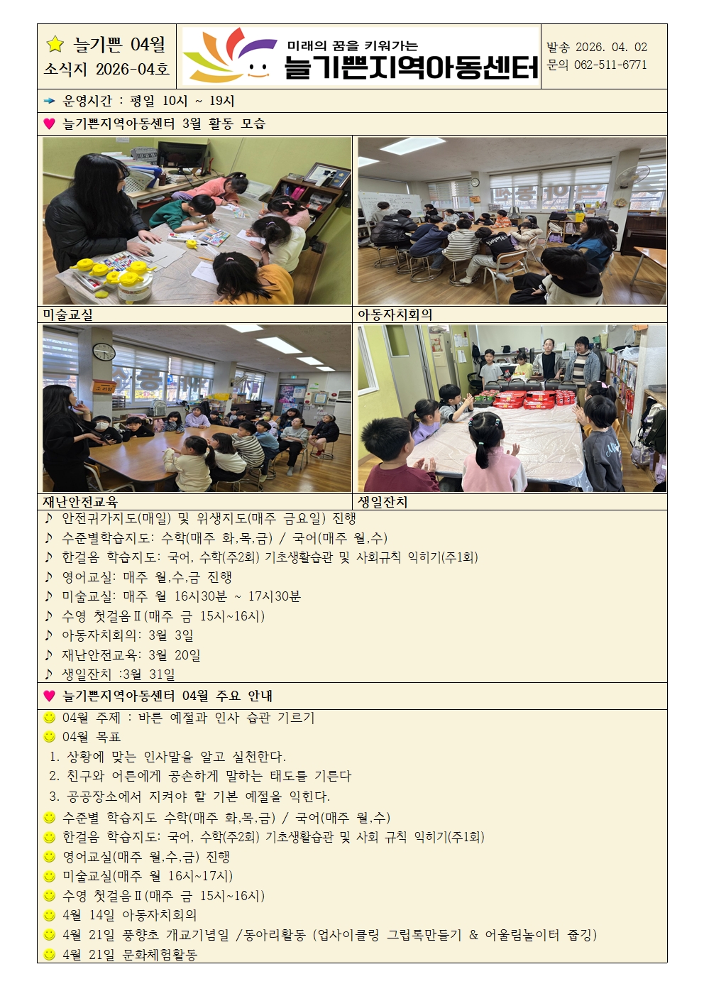 늘기쁜사회적협동조합 늘기쁜지역아동센터 | 광주광역시 북구 서방로 148-0 두암동 2층 [지도보기] Tel : 062-511-6771 Fax : 062-513-6770 E-mail : hlog_a04123@naver.com