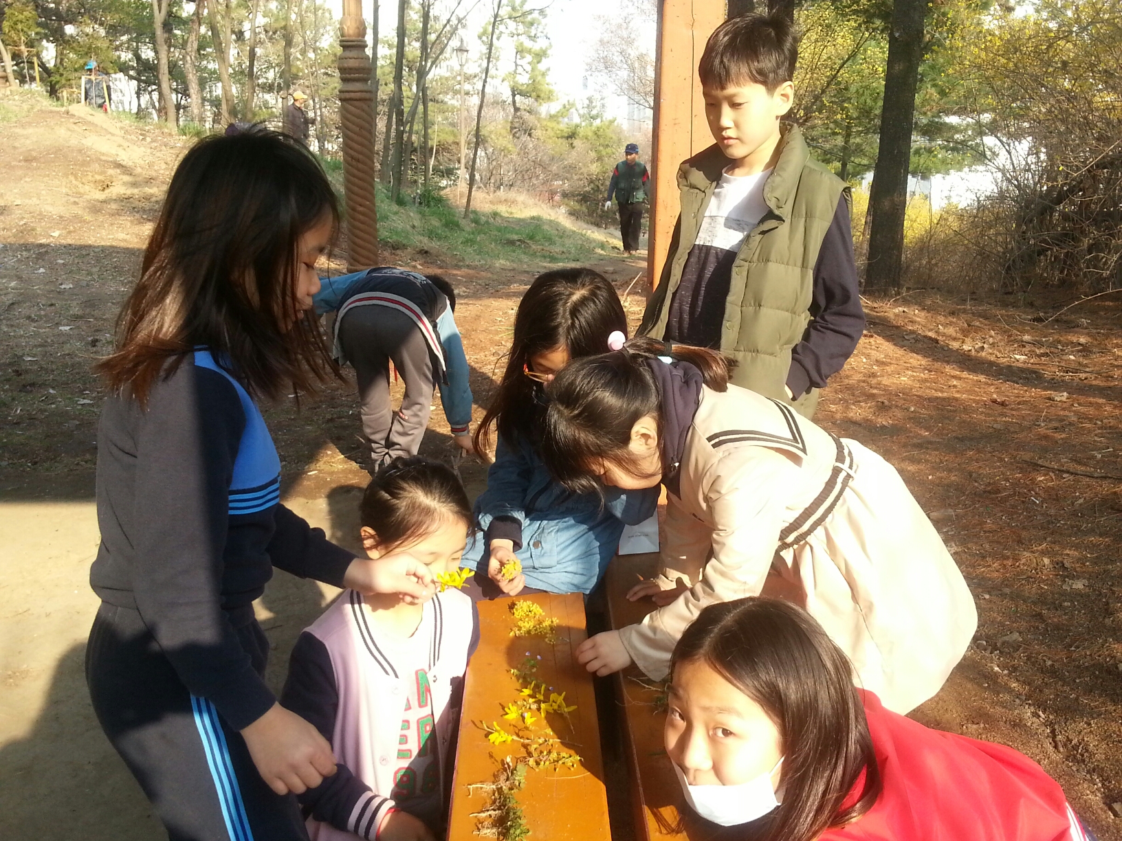 숲 체험을 떠났어요. 센터에서 걸어서 10분 정도에 나지막한 동산이 있어서 봄동산의 봄꽃들과 풀들을 살펴 보며 자연속에서 즐거워 하고 있어요. 이름 모를 작은 풀꽃들과 풀들을 보며 봄을 느끼고 있어요. 센터에 도착해서 멋진 작품도 만들어 보았어요..
