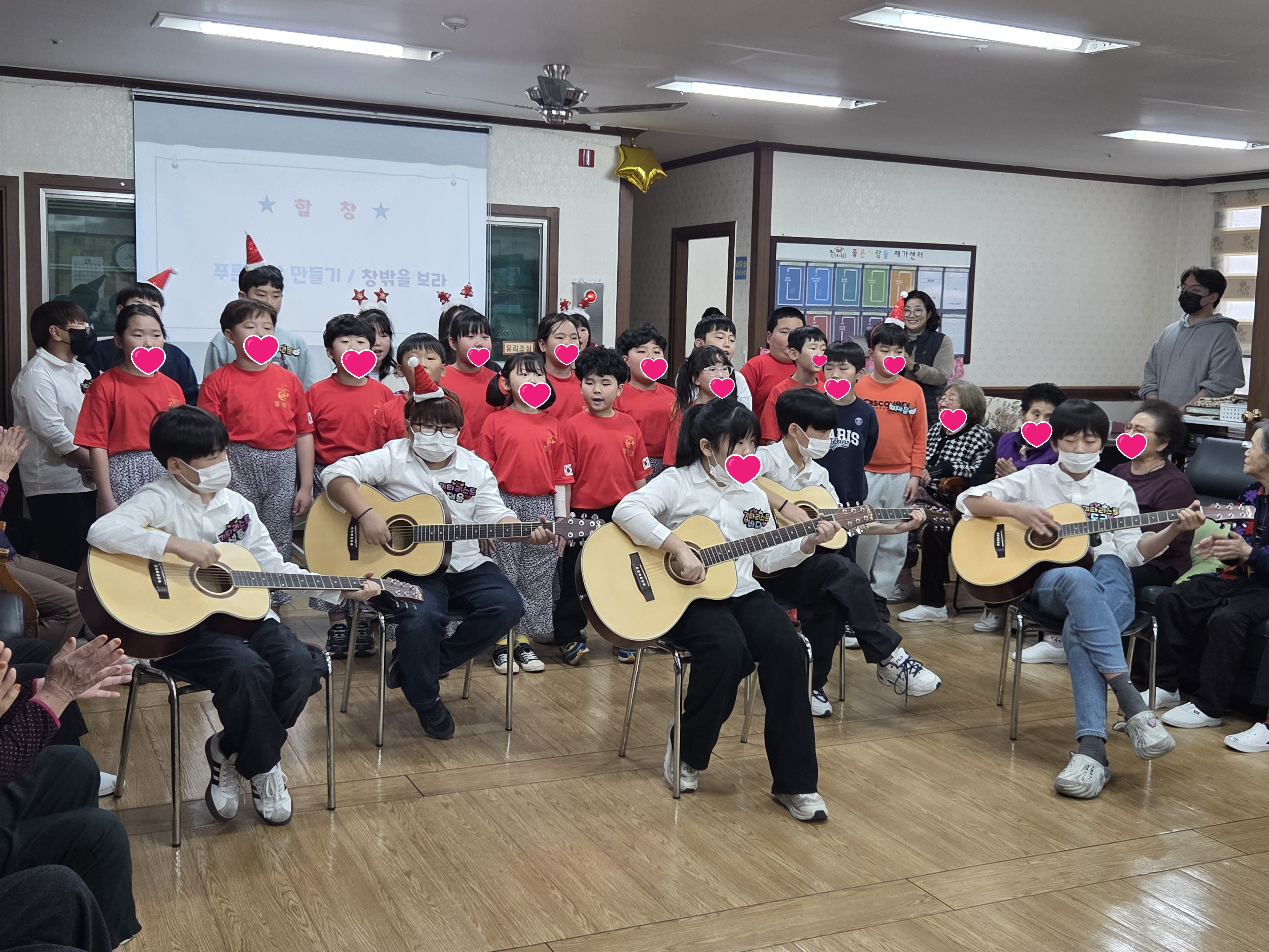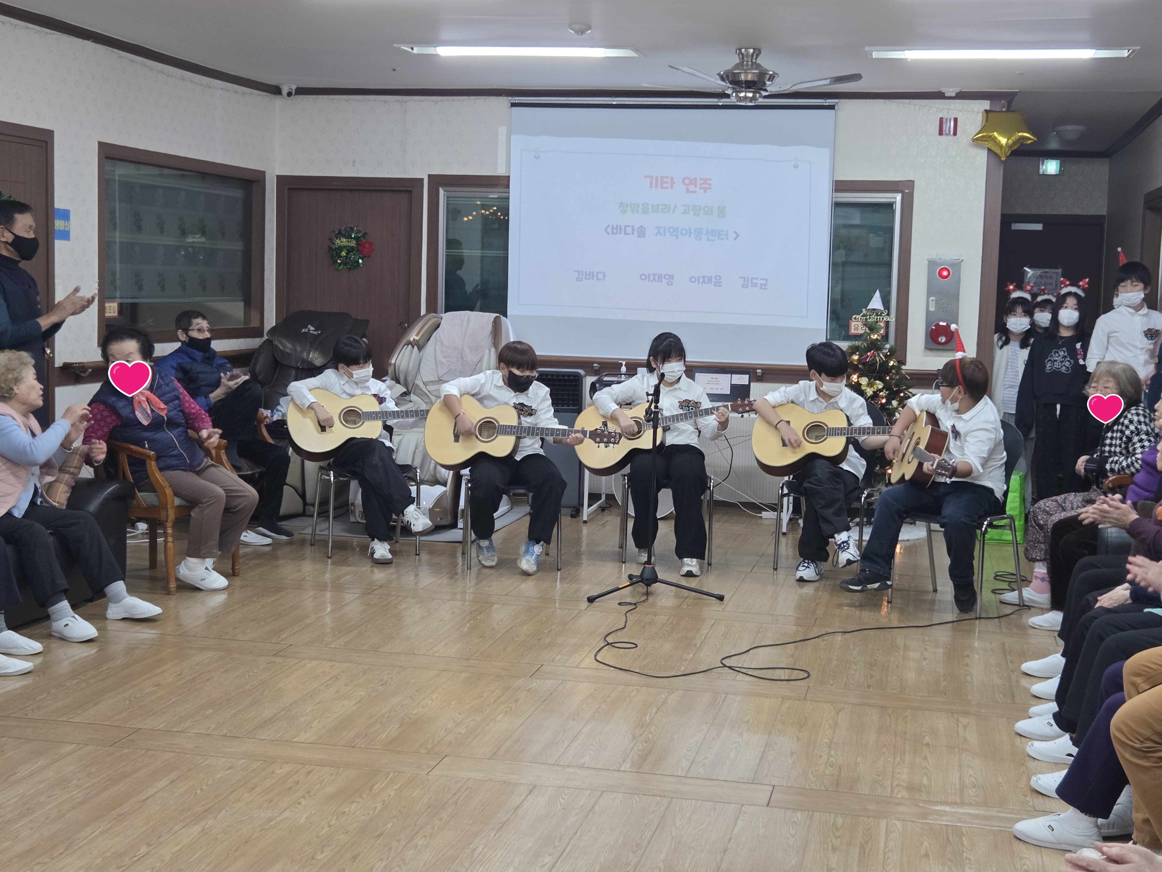 주간보호센터에서 기타 수업의 발표회 겸 어르신들 위문공연을 하였습니다. 포항빛살지역아동센터와 함께 연계로 진행된 프로그램에서 우리 아이들은 연습한 기타와 노래로 어르신들께 즐거움을 전해드리고 왔습니다.