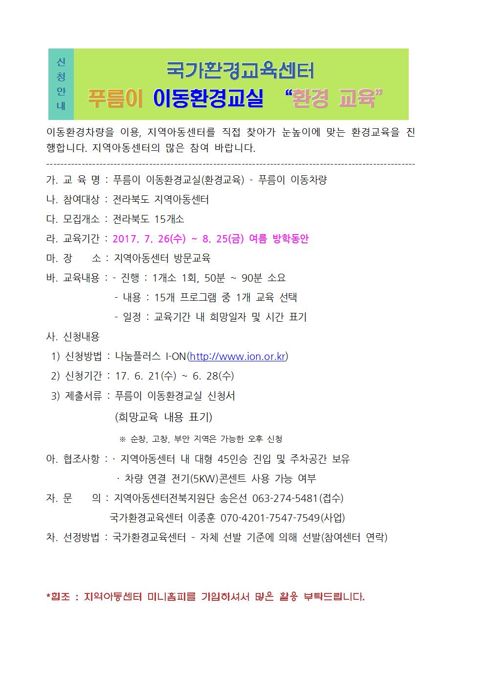 접수기간 : 2017-06-21 ~ 2017-06-28 지원처 : 전북푸름이이동환경교실