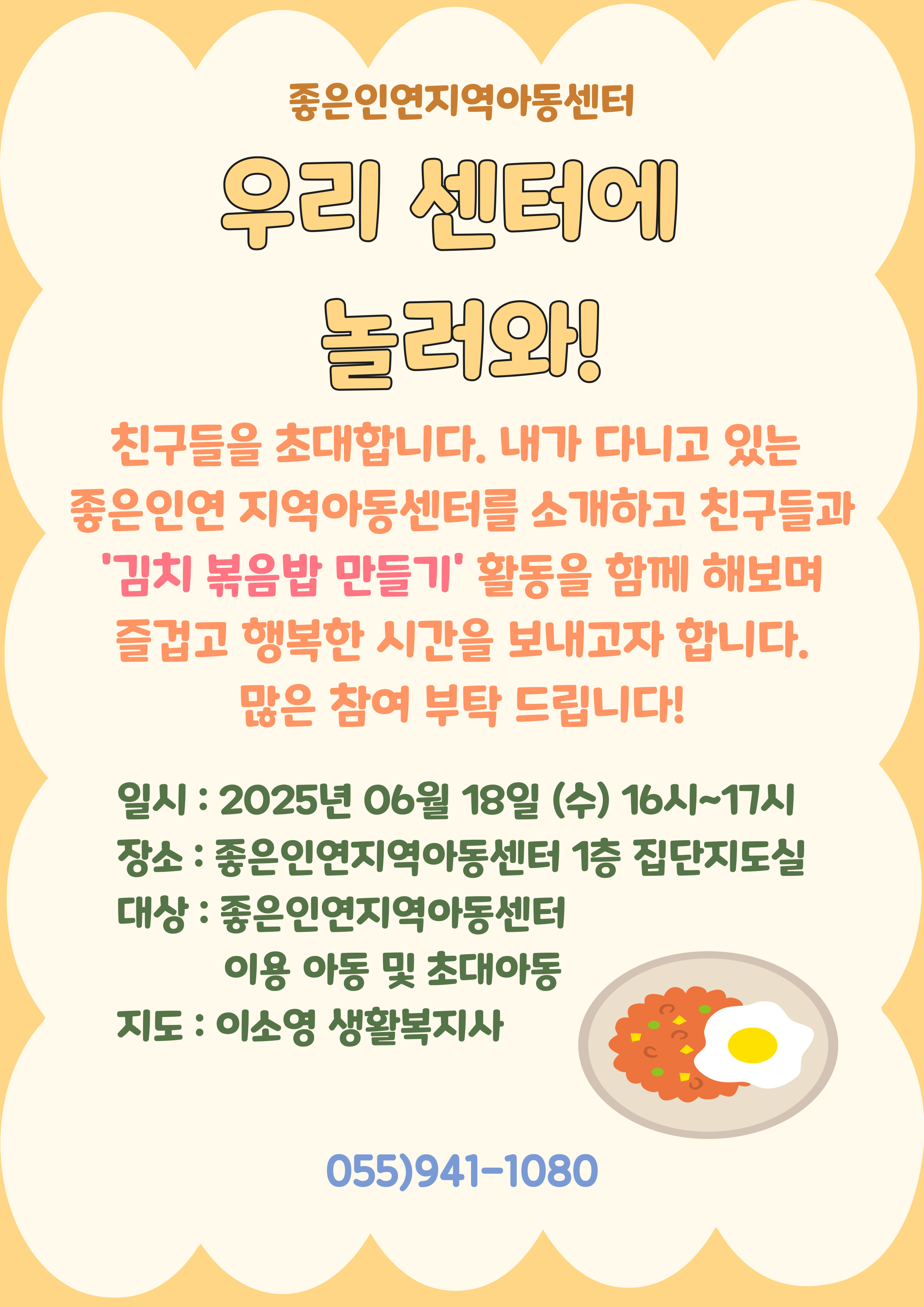 2025년 06월 18일 (수) '우리 센터에 놀러와!' 프로그램 시간에 <김치볶음밥 만들기> 활동을 진행하고자 합니다.
