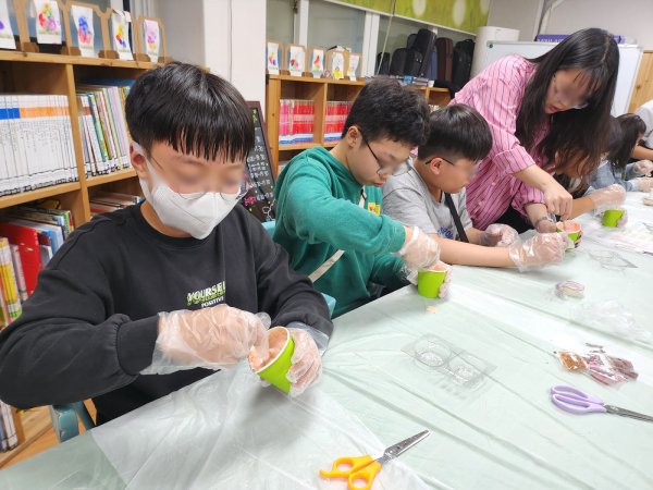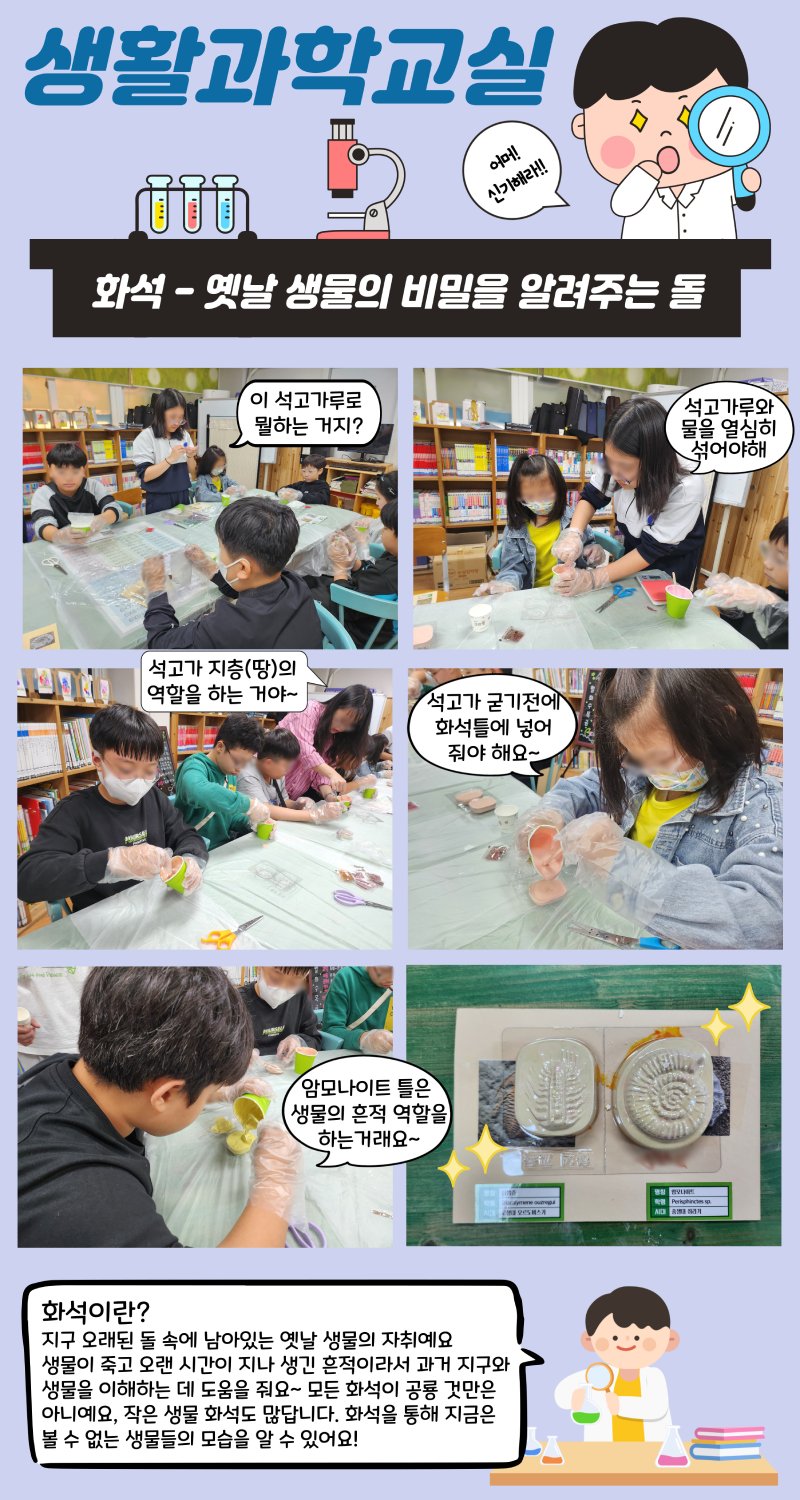 오늘은 화석에 대해 수업했어요~ 석고가루를 이용해서 화석도 직접 만들어봤는데 신기했어요!