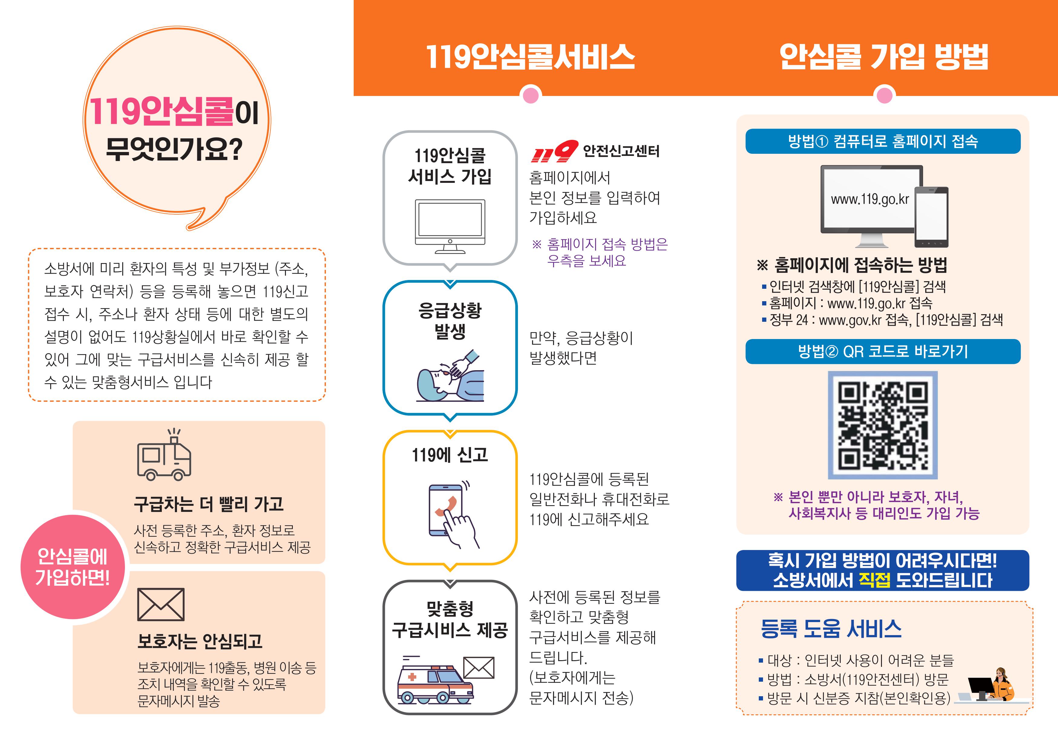 질병자, 장애인, 독거노인, 나홀로어린이, 외국인 등 요구호자에 대한 정보를 사전에 인터넷을 통해 DB화하여 119신고 시, 119출동대가 요구호자의 질병특성 및 상황특성을 미리 알고 출동하여, 맞춤형으로 대응하고 관계자에게 통보하는 것으로, 특히 이동전화 이용시에도 언제 어디서나 위치파악이 가능하여 최인접 119출동대가 신속 출동함으로써 소생률을 높일 수 있습니다. [출처_소방청]