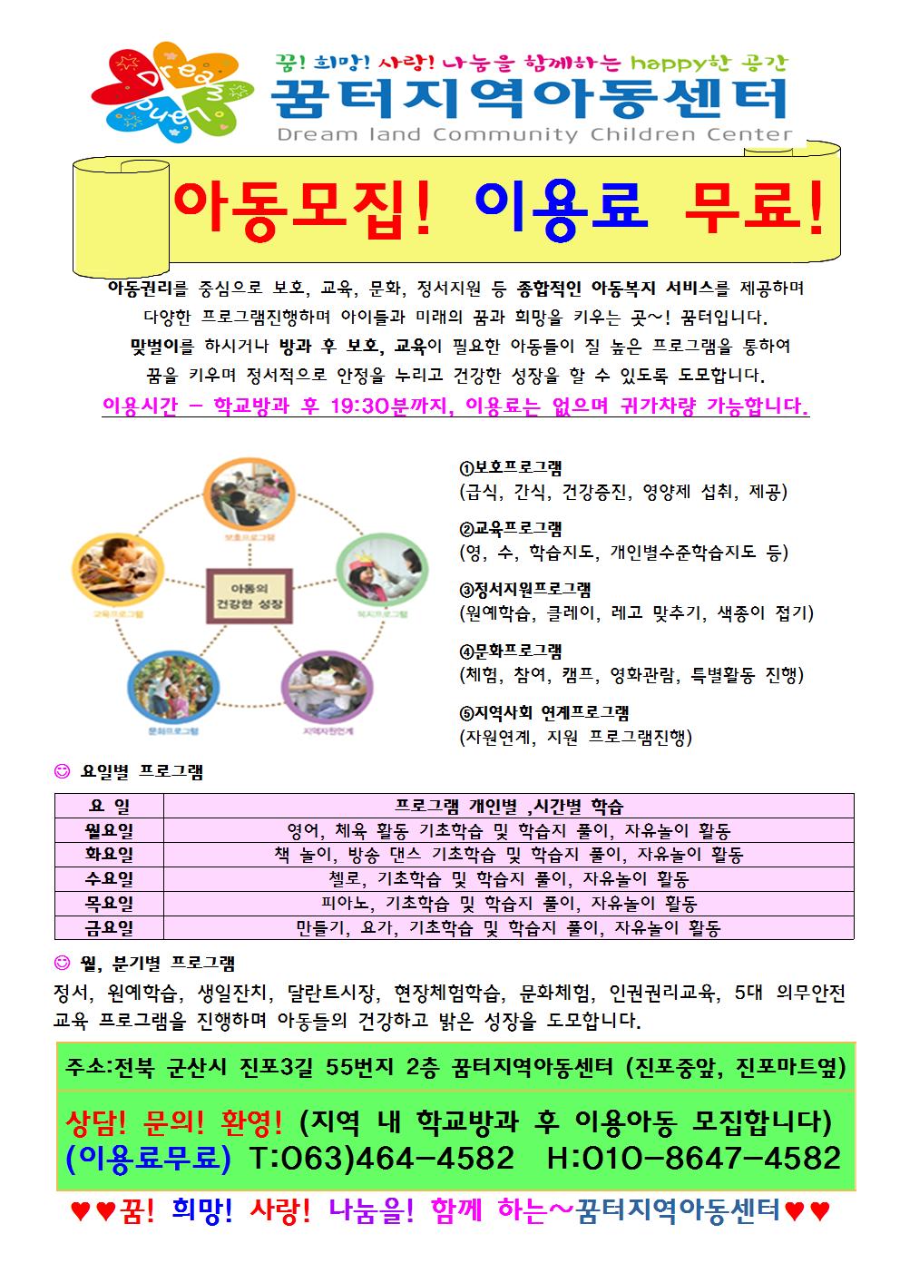 꿈터 복지사 채용공고꿈터지역아동센터 | 전라북도 군산시 대위로 431 2층 [지도보기] Tel : 063-464-4582 Fax : 063-464-4581 E-mail : dreamland4582@naver.com