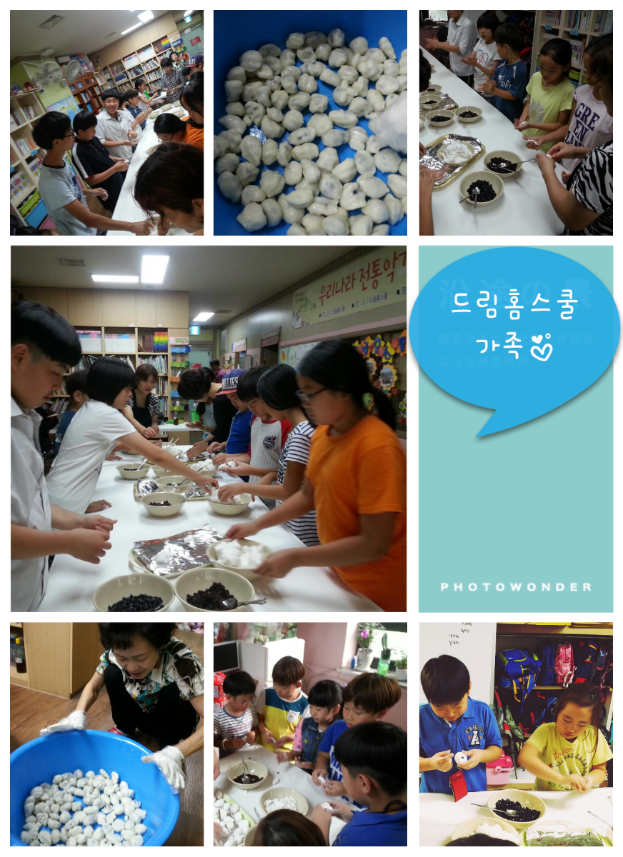 드림홈스쿨 가족은 추석 명절을 맞이하여 송편빚기를 했습니다. 삼삼오오 모여서 고사리같은 손으로 추석을 맞이했습니다. 드림홈스쿨에서는 해마다 추석이 되면 송편을 빚어 홈스쿨 가족과 함께 나누어 먹고 집에 계신 부모님께 대접을 하고 있습니다. 모양이 예쁘지는 않지만 작은 정성을 모아 만든 송편으로 넉넉한 한가위를 보낼 수 있었습니다.
