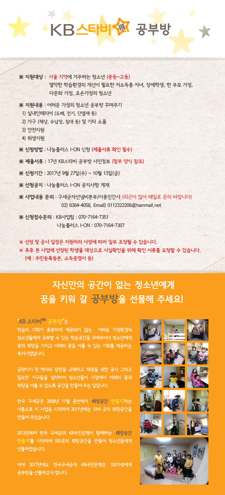 접수기간 : 2017-09-27 ~ 2017-10-13 지원처 : 구세군자선냄비본부