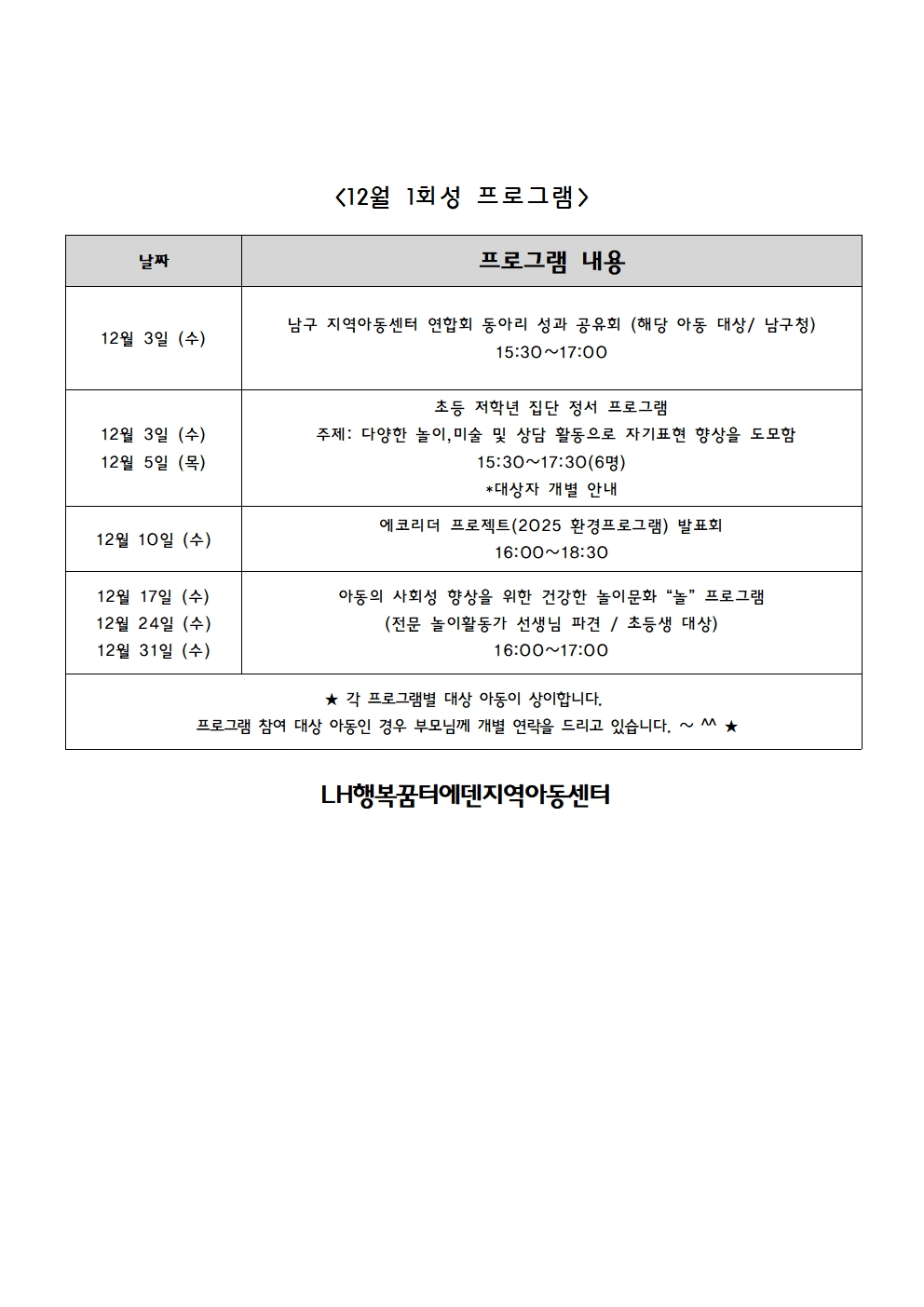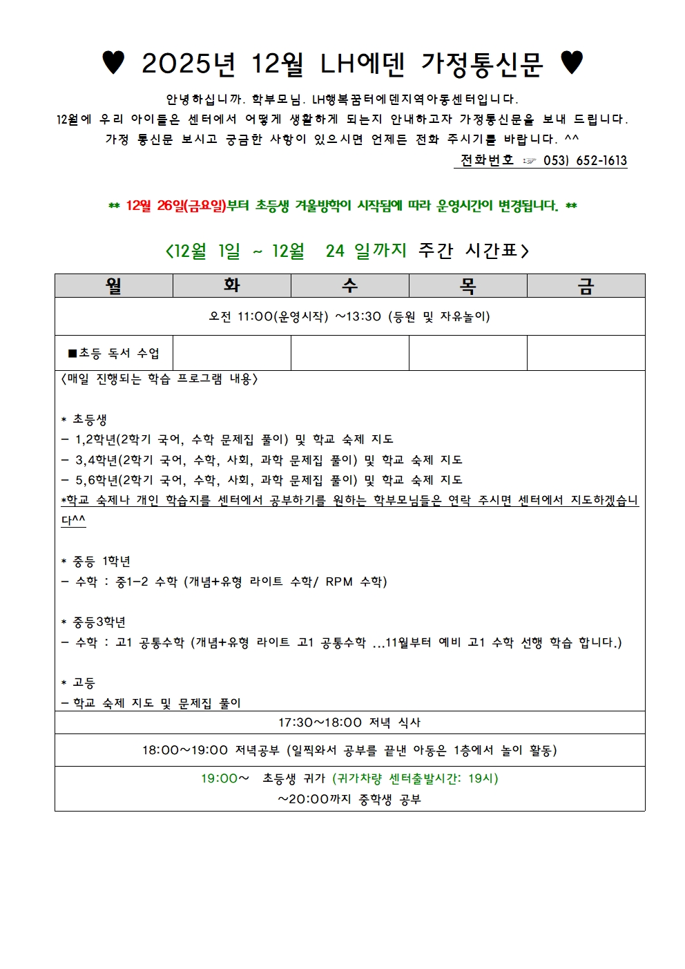 LH행복꿈터에덴지역아동센터 | 대구광역시 남구 큰골4길 19(대명9동 485-14) [지도보기] Tel : 053-652-1613 Fax : 053-651-1613 E-mail : edendream9@hanmail.net