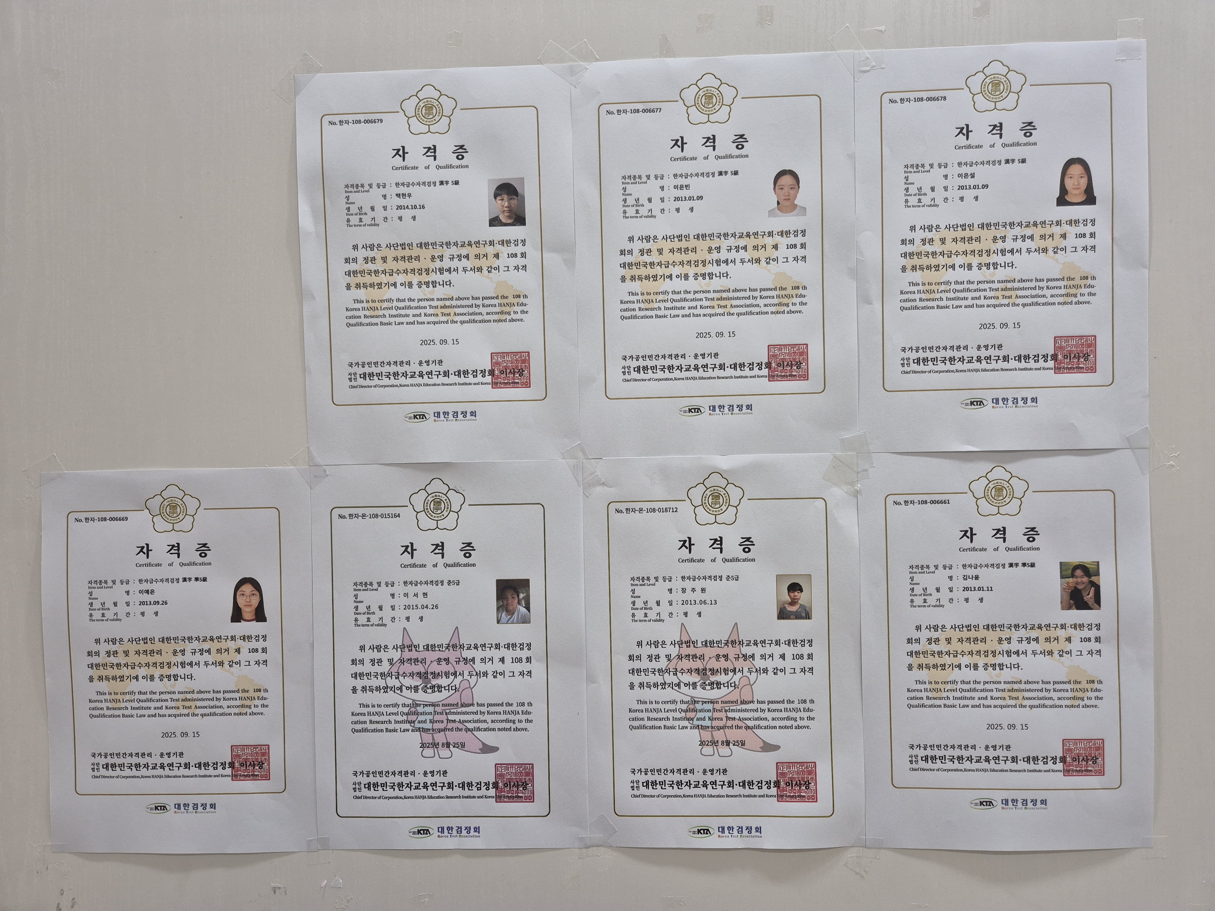 2025년 함지 한자교실을 통해 7명의 아동이 준5급~5급 대한 검정회 한자 자격증을 취득하였습니다.