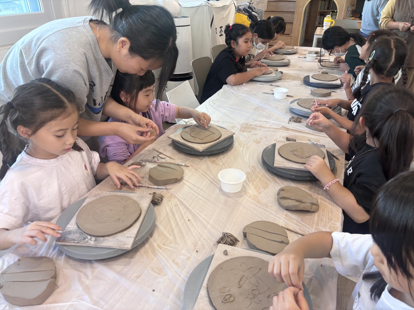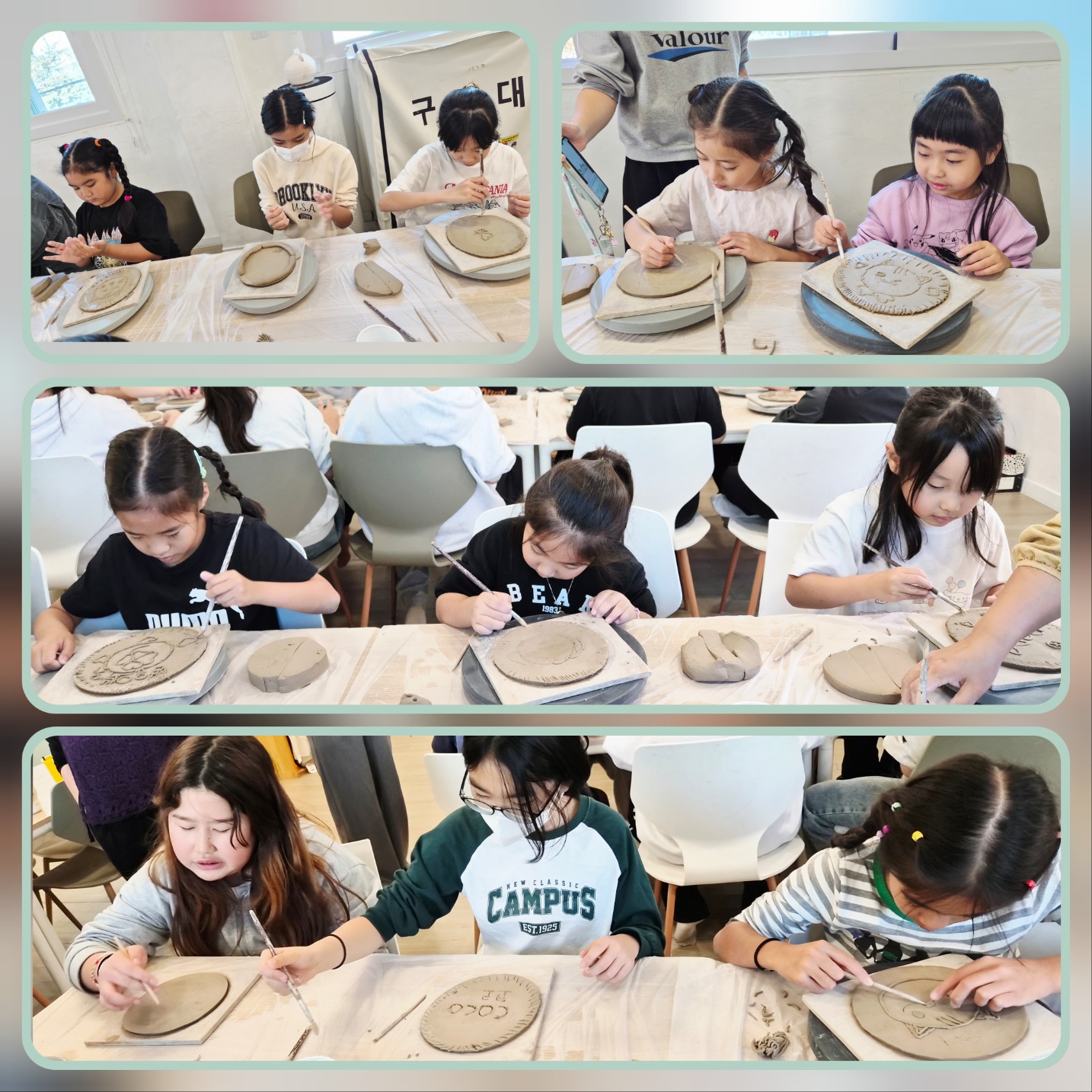 우리가 흔히 아는 황토색이 아닌 구워지면 하얀빛을 내는 회색빛이 도는 흙을 이용해 그리고싶은 동물이나 캐릭터를 살살 그려 입체감있게 표현했어요.
