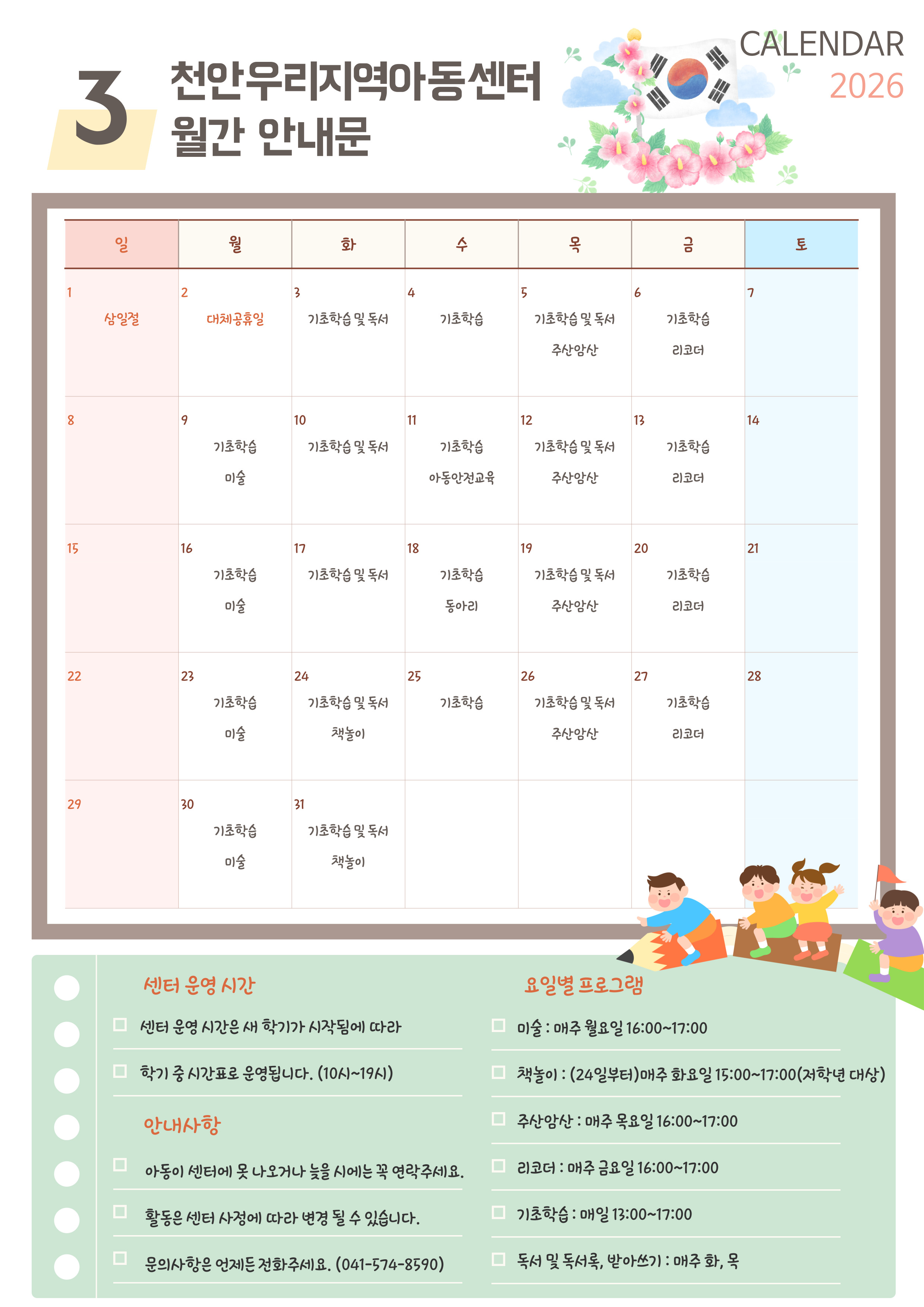 천안우리지역아동센터 | 충청남도 천안시 동남구 쌍용대로 94-7 2층 (봉명동) [지도보기] Tel : 041-574-8590 Fax : 0504-137-1263 E-mail : chmo8590@daum.net