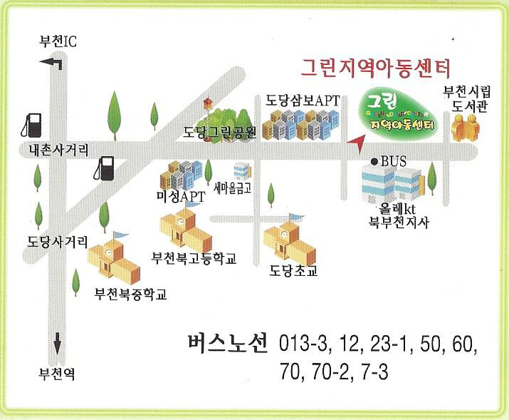 그린지역아동센터 | 경기도 부천시 원미구 삼작로 283, 3층 (도당동) [지도보기] Tel : 032-677-3033 Fax : 032-677-3034 E-mail : kjolove0823@naver.com
