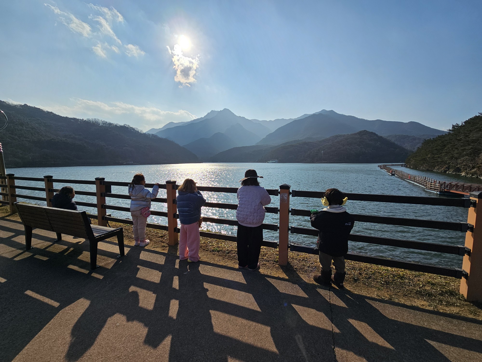 저수지를 걸으면서 산과 물도 보고 공기 좋은 바람도 맞으며 즐거운 시간을 보냈어요~