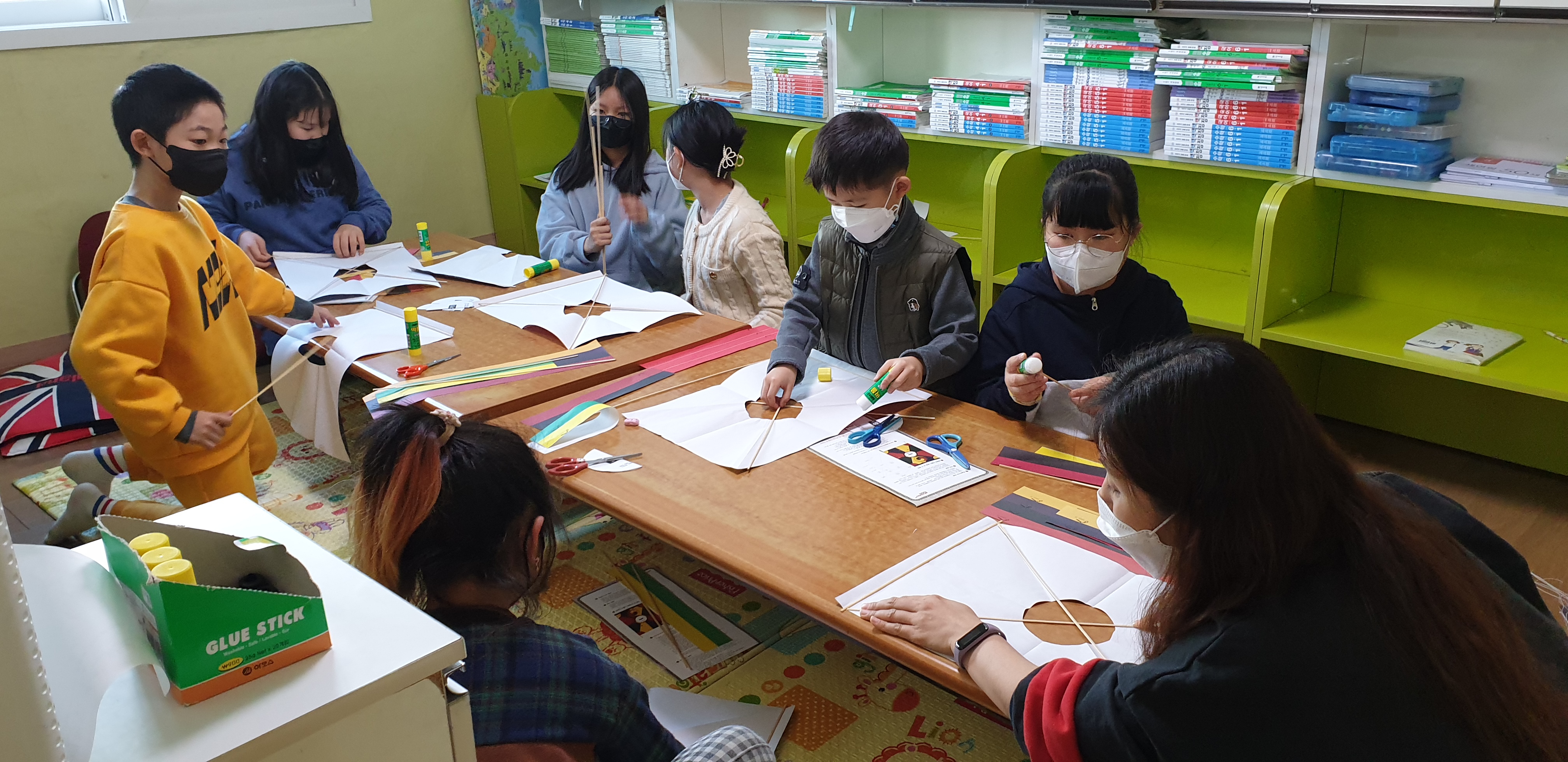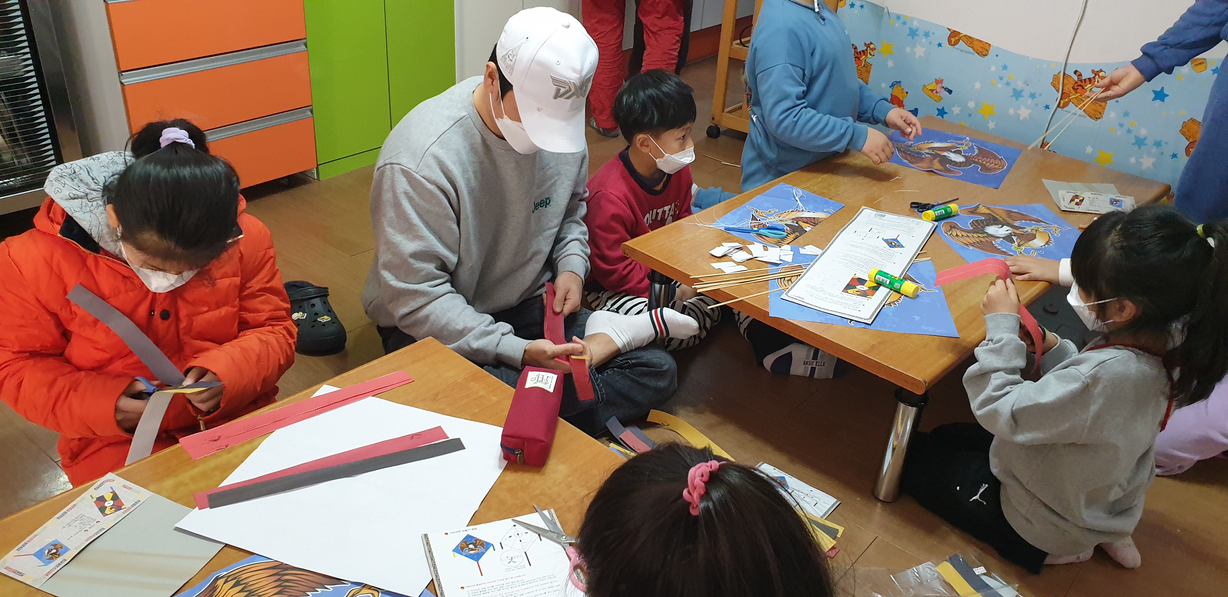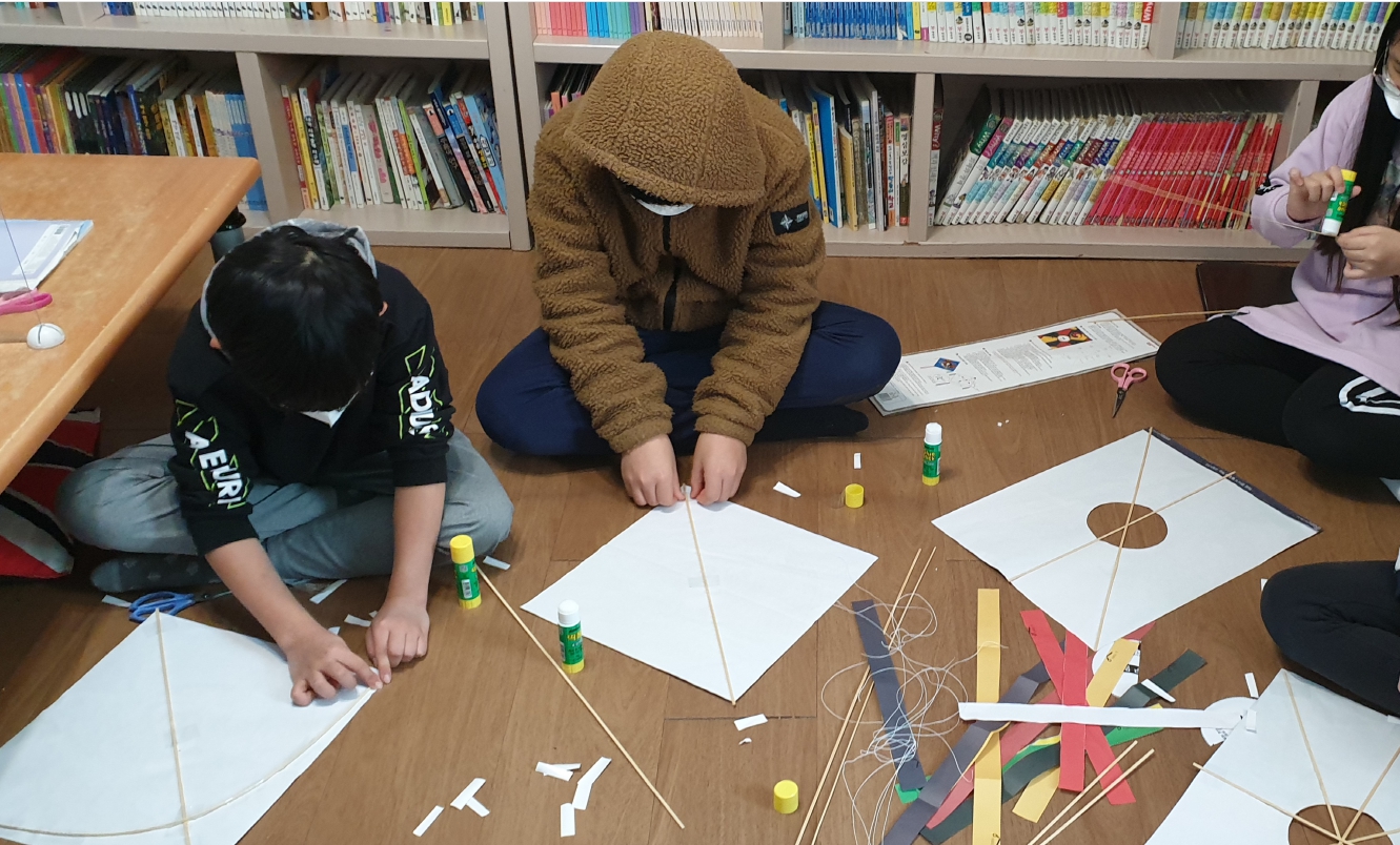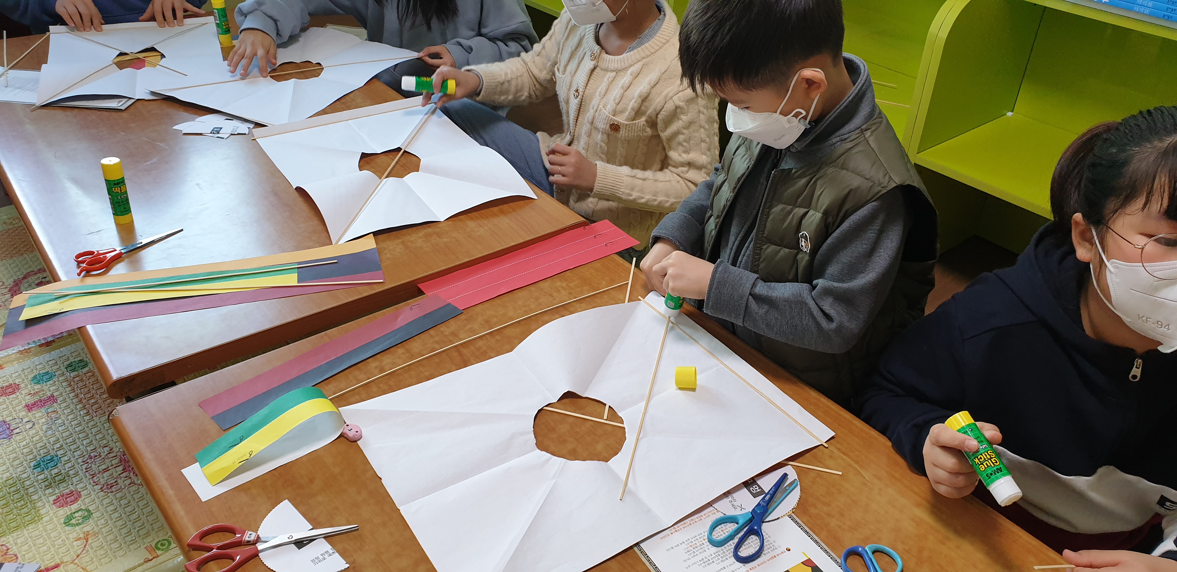 가오리연과 방패연 둘 중에 하나를 선택해 직접 만들어보았는데, 대부분의 아동들이 연만들기를 처음 해보는 거라 어려워하였어요.