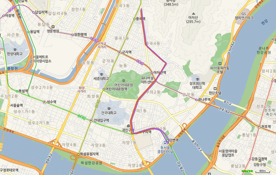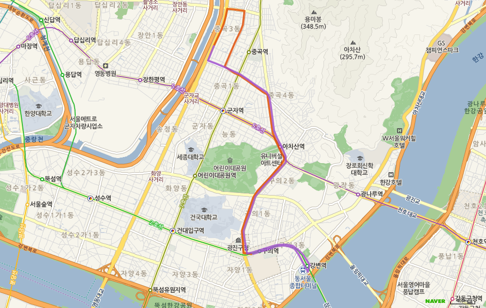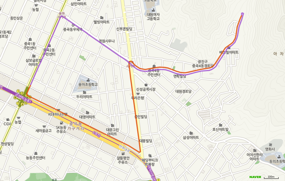 - 1번 출구 하차 후 뒤 골목으로 100m 올라오면 왼쪽 50m (광진03) 마을 버스 이용, 신성시장 하차