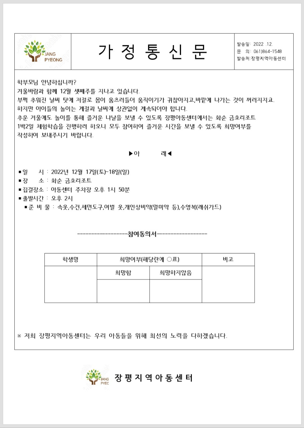 장평지역아동센터 | 전라남도 장흥군 장평면 장평중앙길 73 [지도보기] Tel : 061-864-1548 Fax : 061-864-1547 E-mail : ckj9768@naver.com