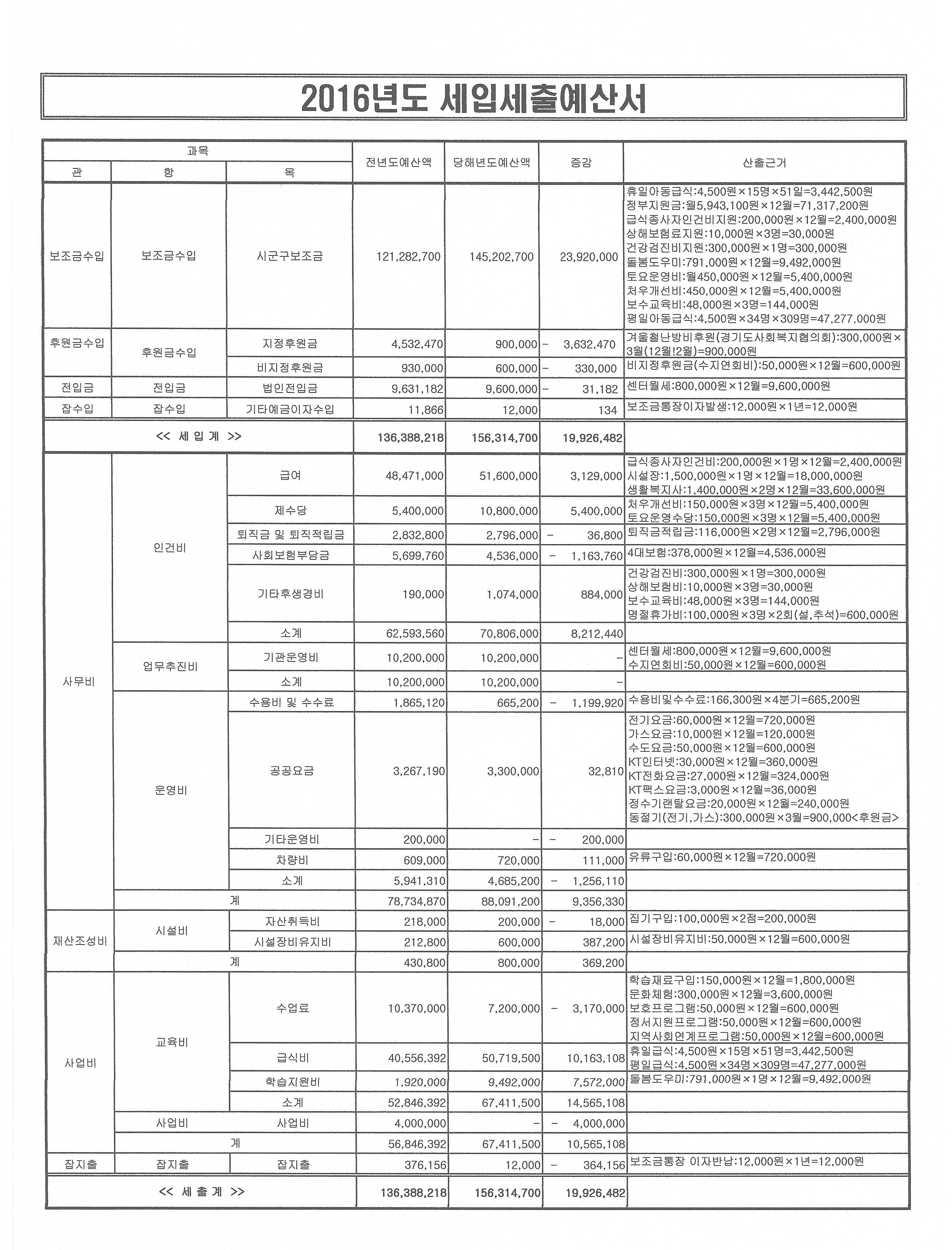 2016년도 조원동지역아동센터 세입세출예산서를 공지합니다.