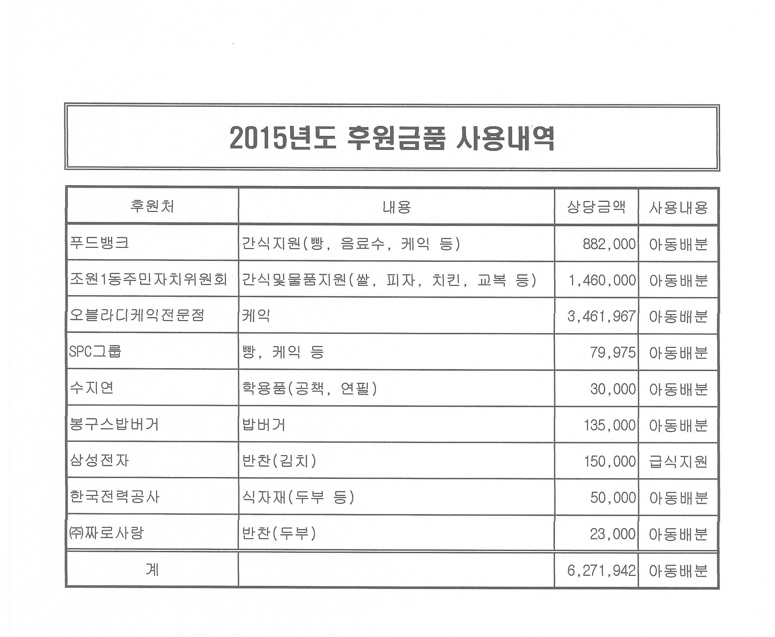 2015년도 조원동지역아동센터 후원금품 사용내역을 공지합니다.