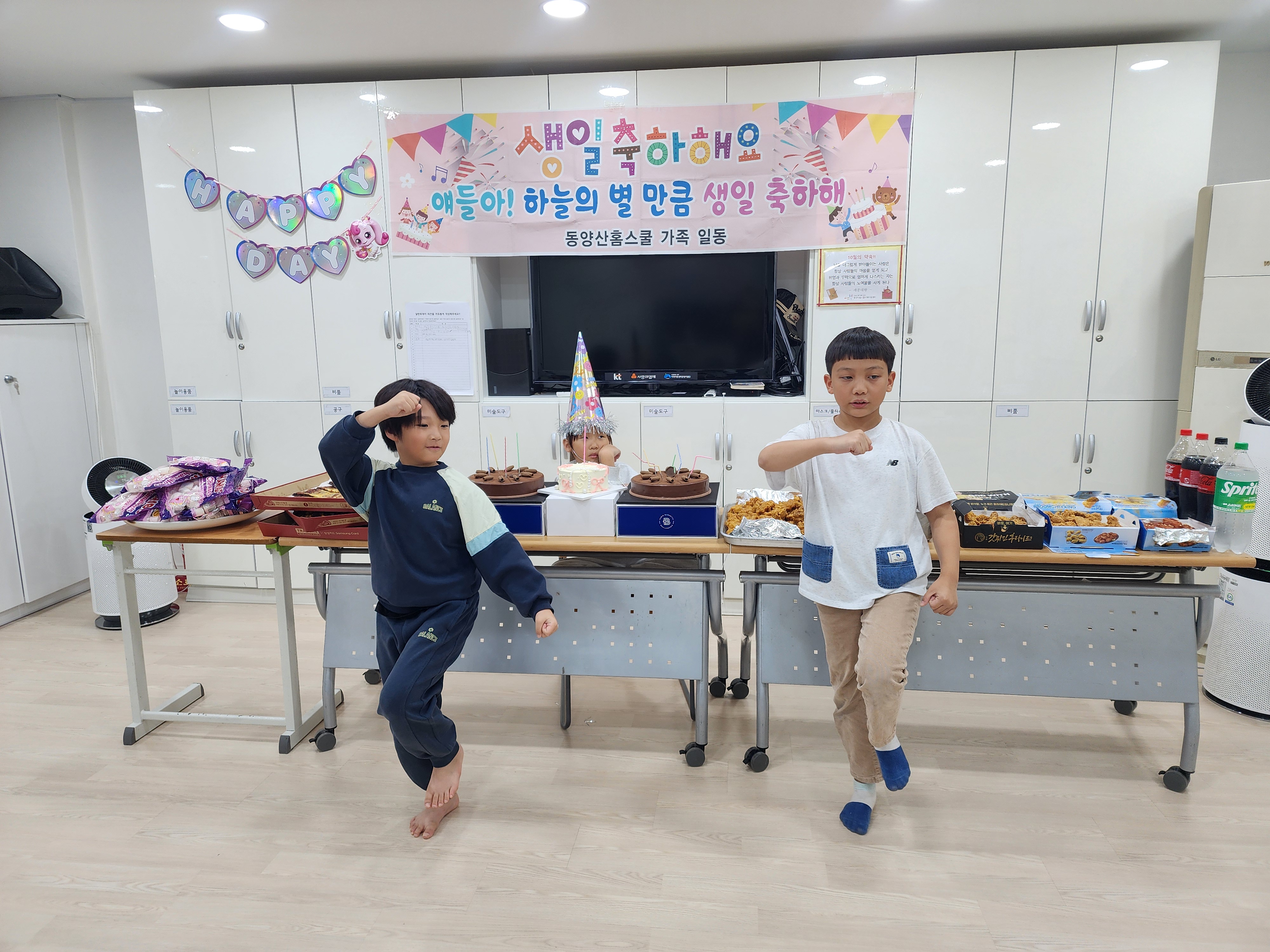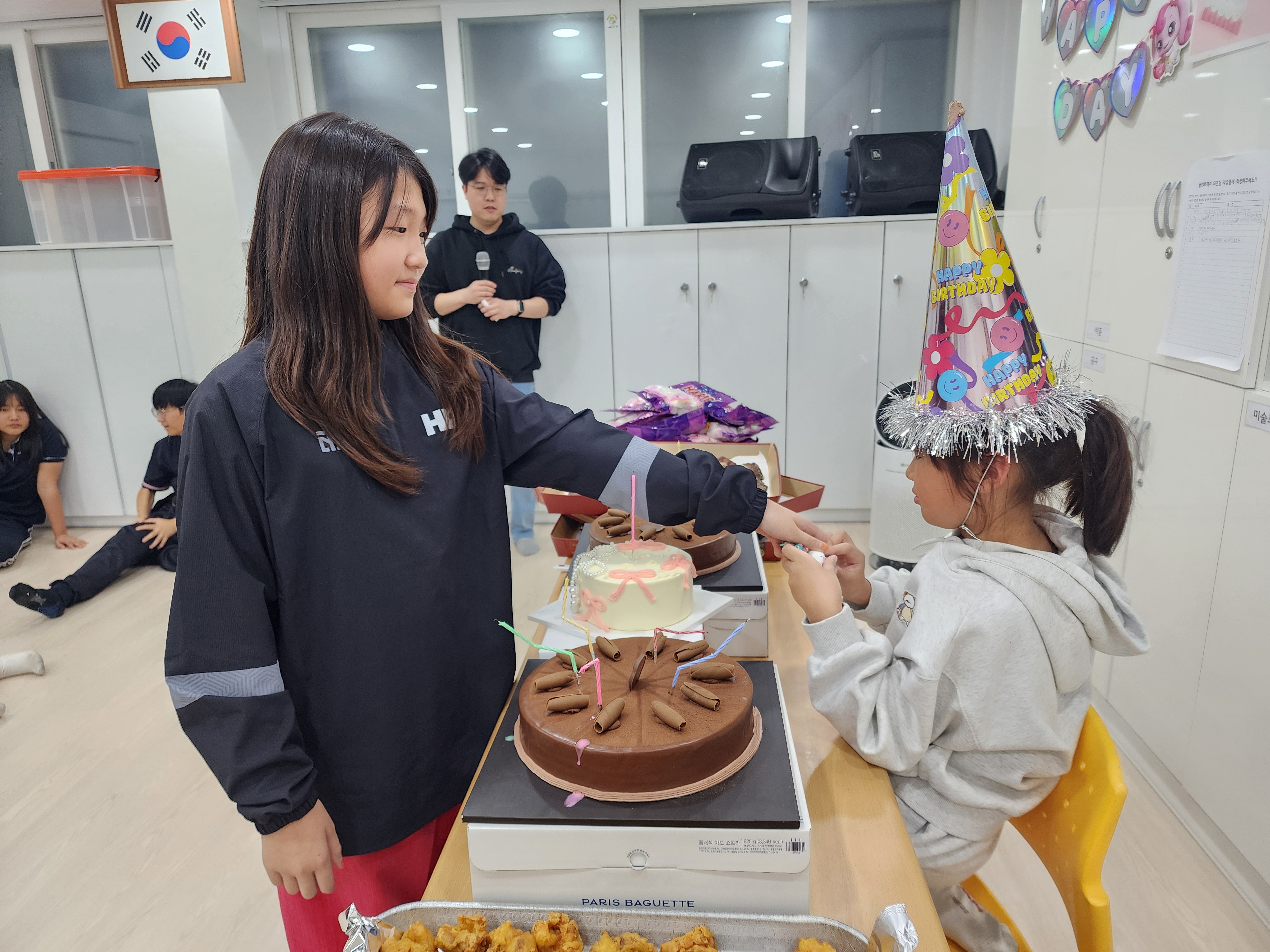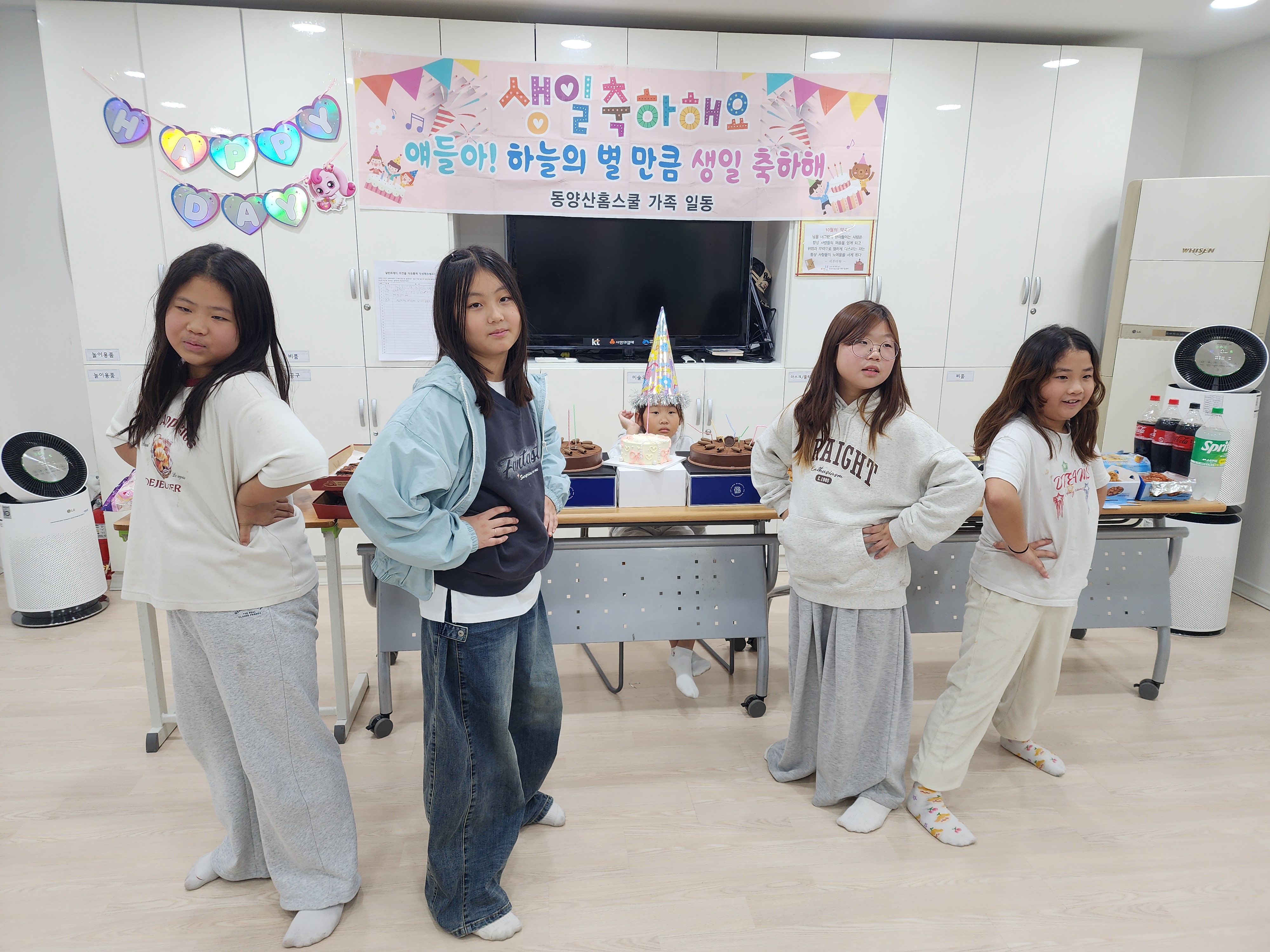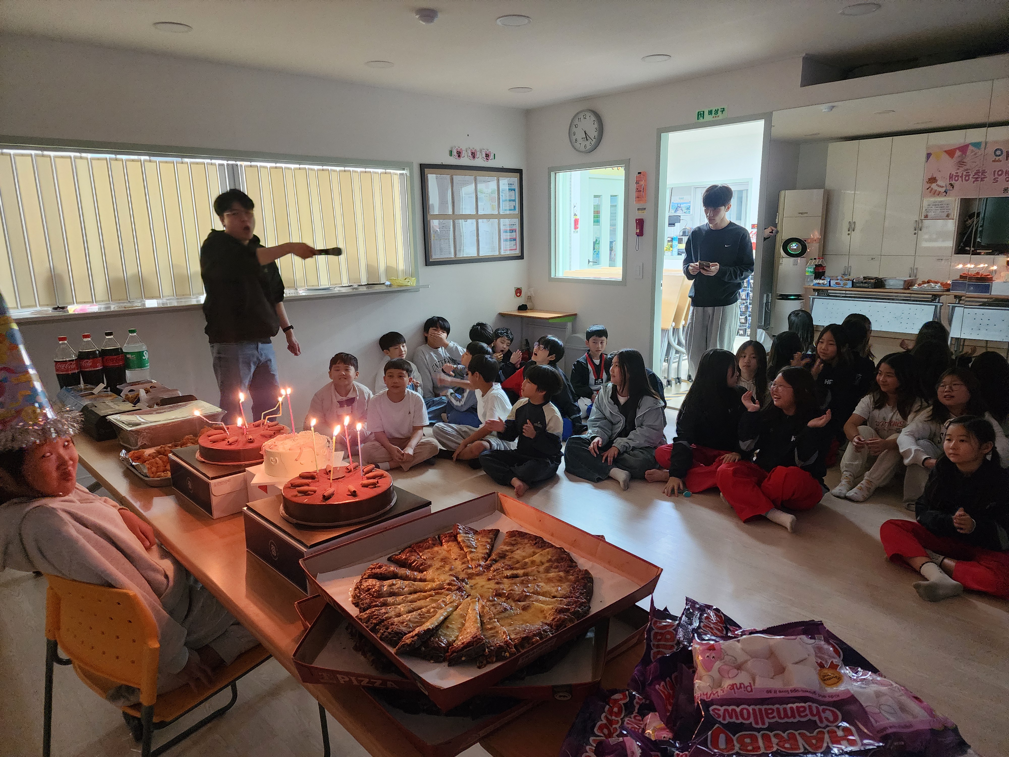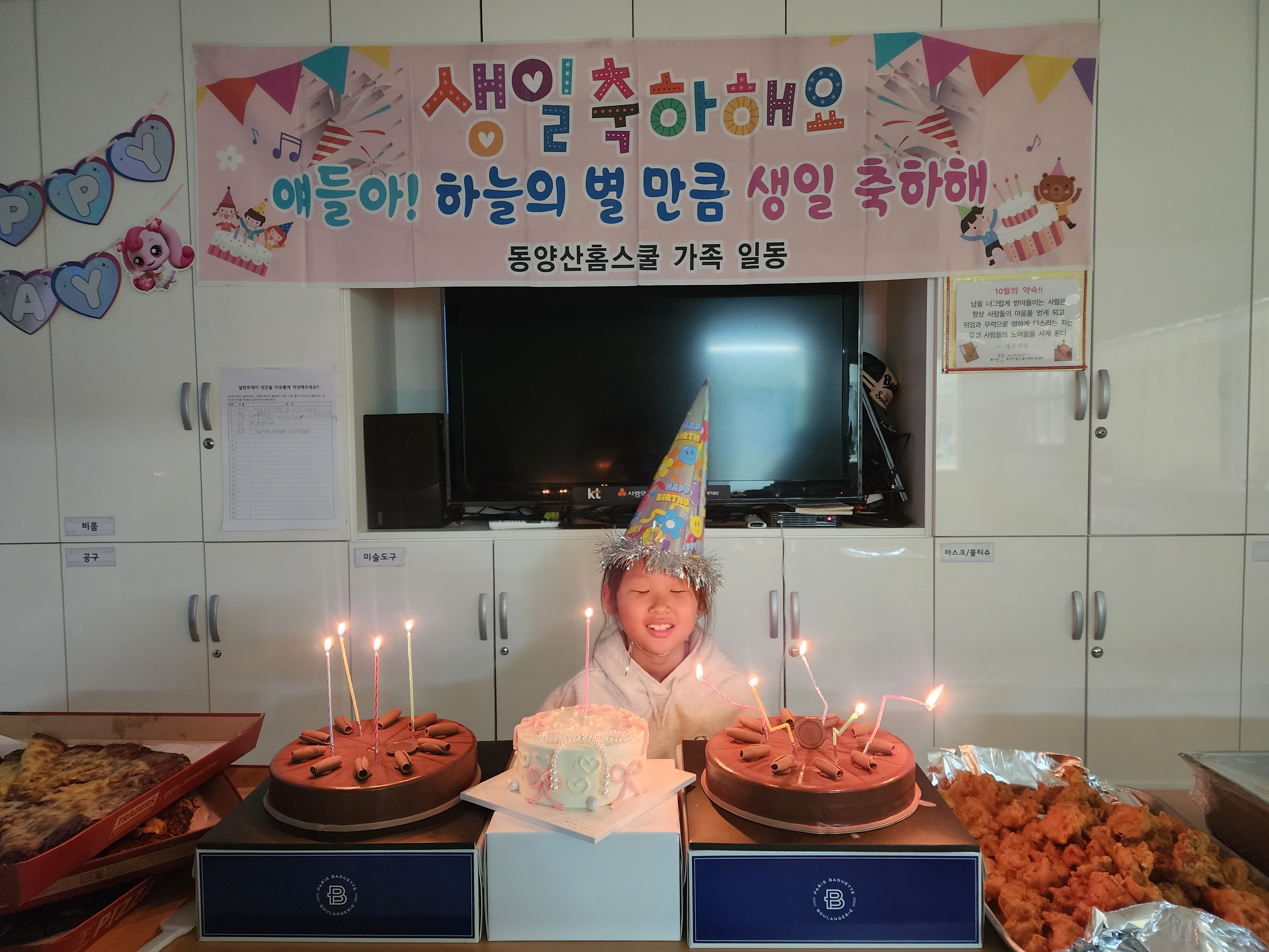 2025년 10월 30일(목) 동양산 10월 생일파티가 진행되었습니다. 이번 생일은 초등 2학년 조윤혜 아동의 단독 생일파티였습니다. 생일을 맞은 아동의 가정에서 피자 3판을, 서창 메나케끼에서 수제 케이크를, BBQ 평산점에서 치킨 4박스와 음료를, 갓튀긴후라이드 평산점에서 치킨 2박스와 음료를 후원해 주셔서 푸짐하고 즐거운 생일파티가 열렸습니다.
