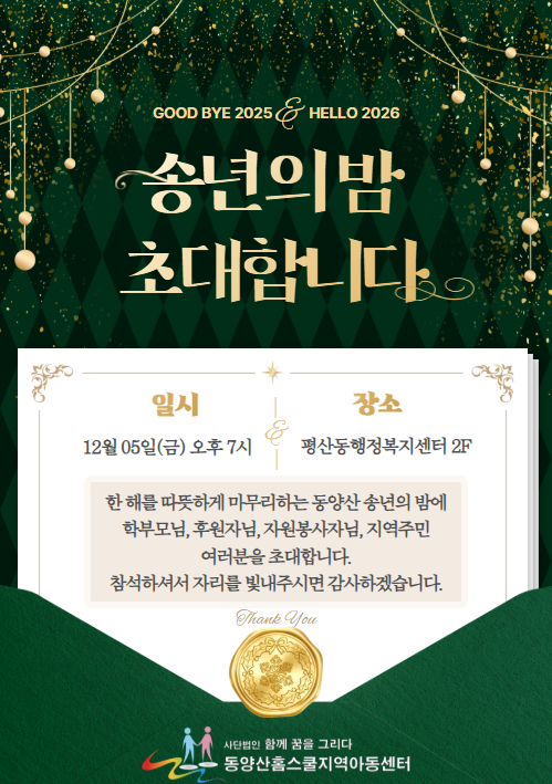 함께한 마음을 나누고자 2025 동양산 송년의 밤 행사에 학부모님, 후원자님, 자원봉사자님, 그리고 지역사회 주민 여러분을 정중히 초대합니다.