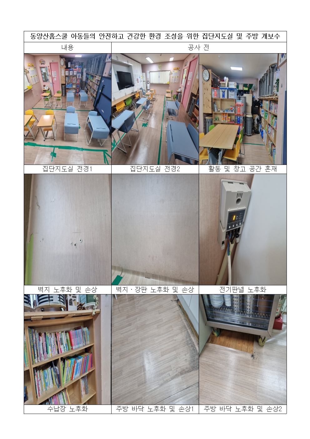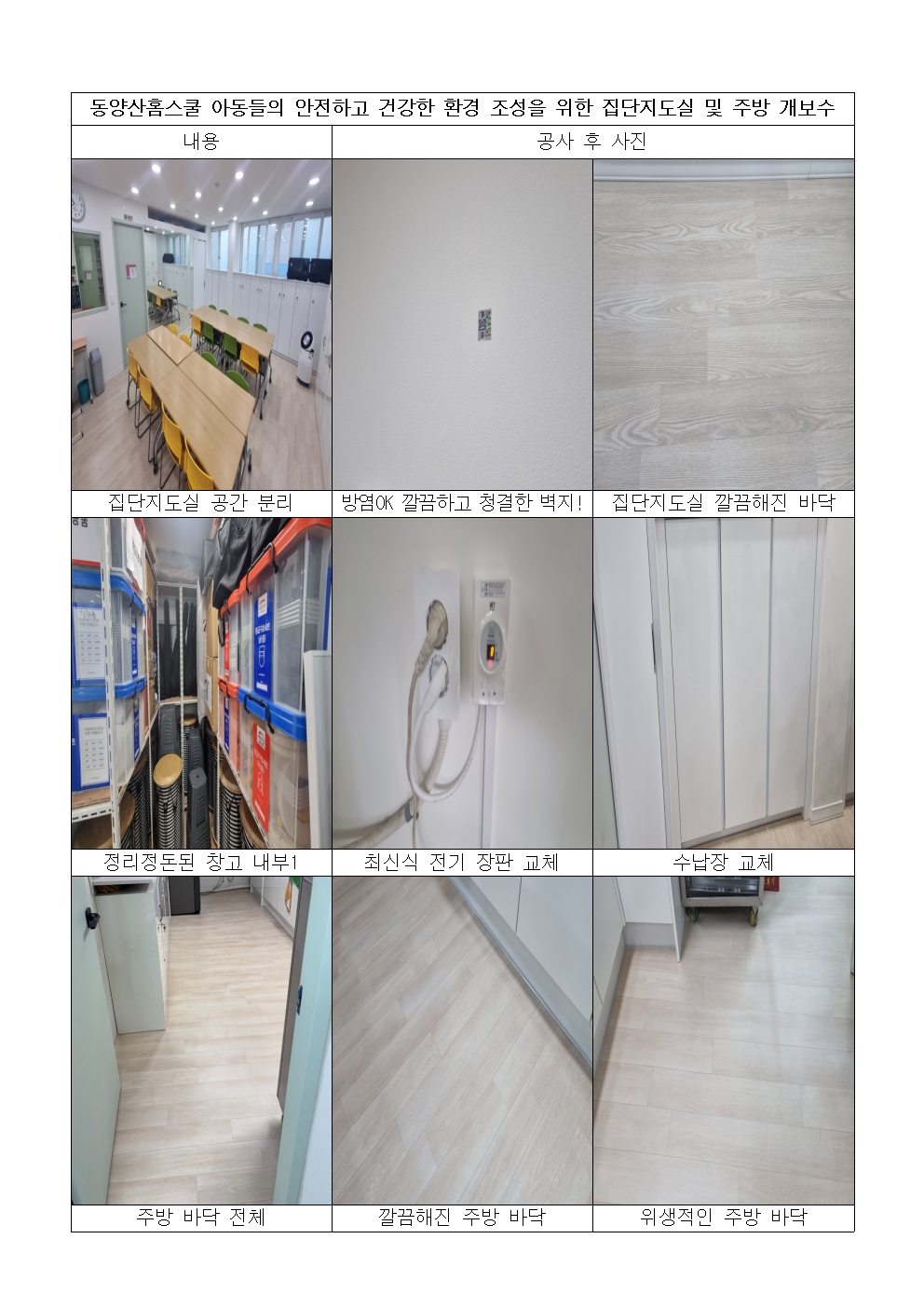 2025년 신청사업 1차 복지현안 지원사업으로 사회복지공동모금회의 지원을 받아 7월 26일부터 8월 3일까지 약 1주일간 "동양산홈스쿨 아동들의 안전하고 건강한 환경 조성을 위한 집단지도실 및 주방 개보수" 공사가 진행되었습니다!
