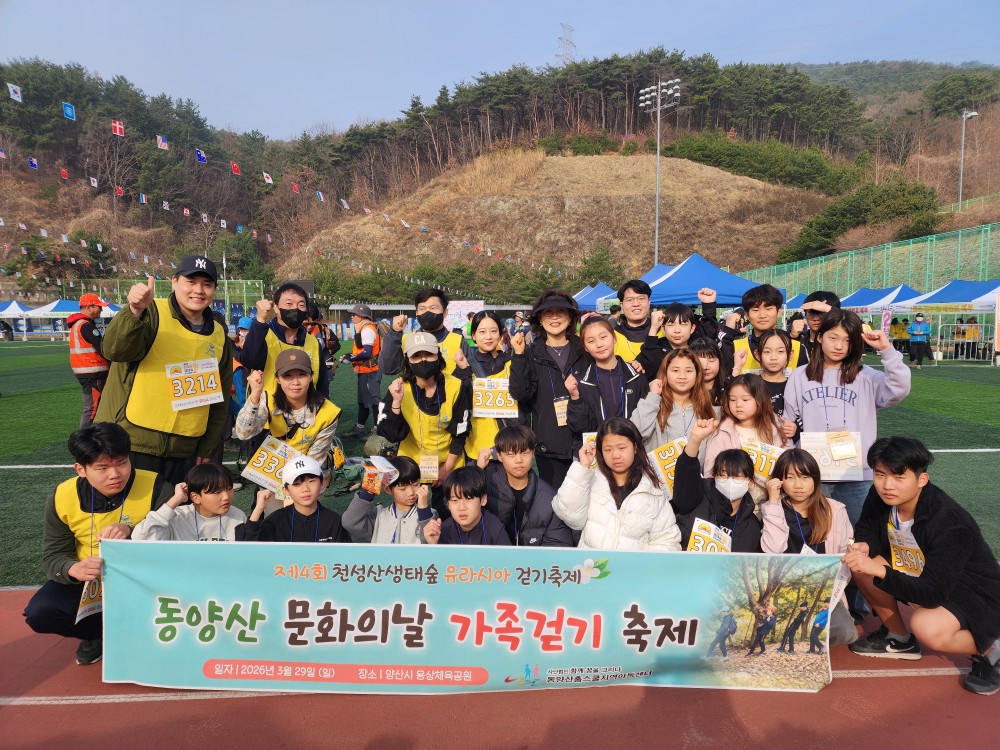 2026년 3월 29일(일) 제4회 천성산 생태숲길 유라시아 걷기 축제가 진행되었습니다. 이날은 동양산 문화의 날 가족걷기 축제로 함께 운영되었으며, 동양산 가족 50여 명이 참여하였습니다.