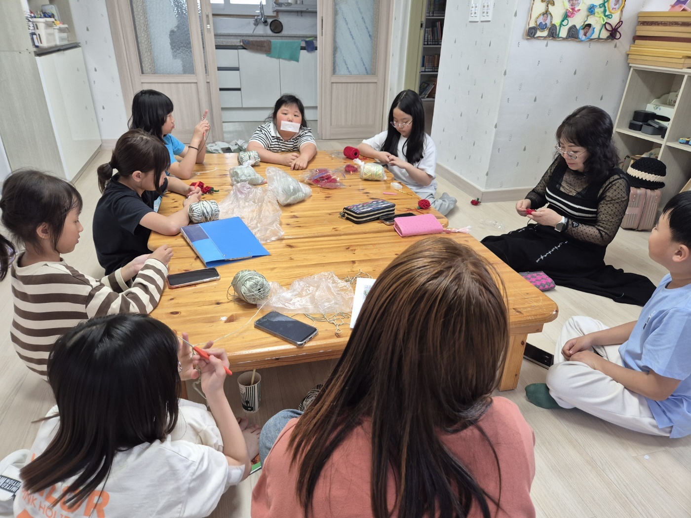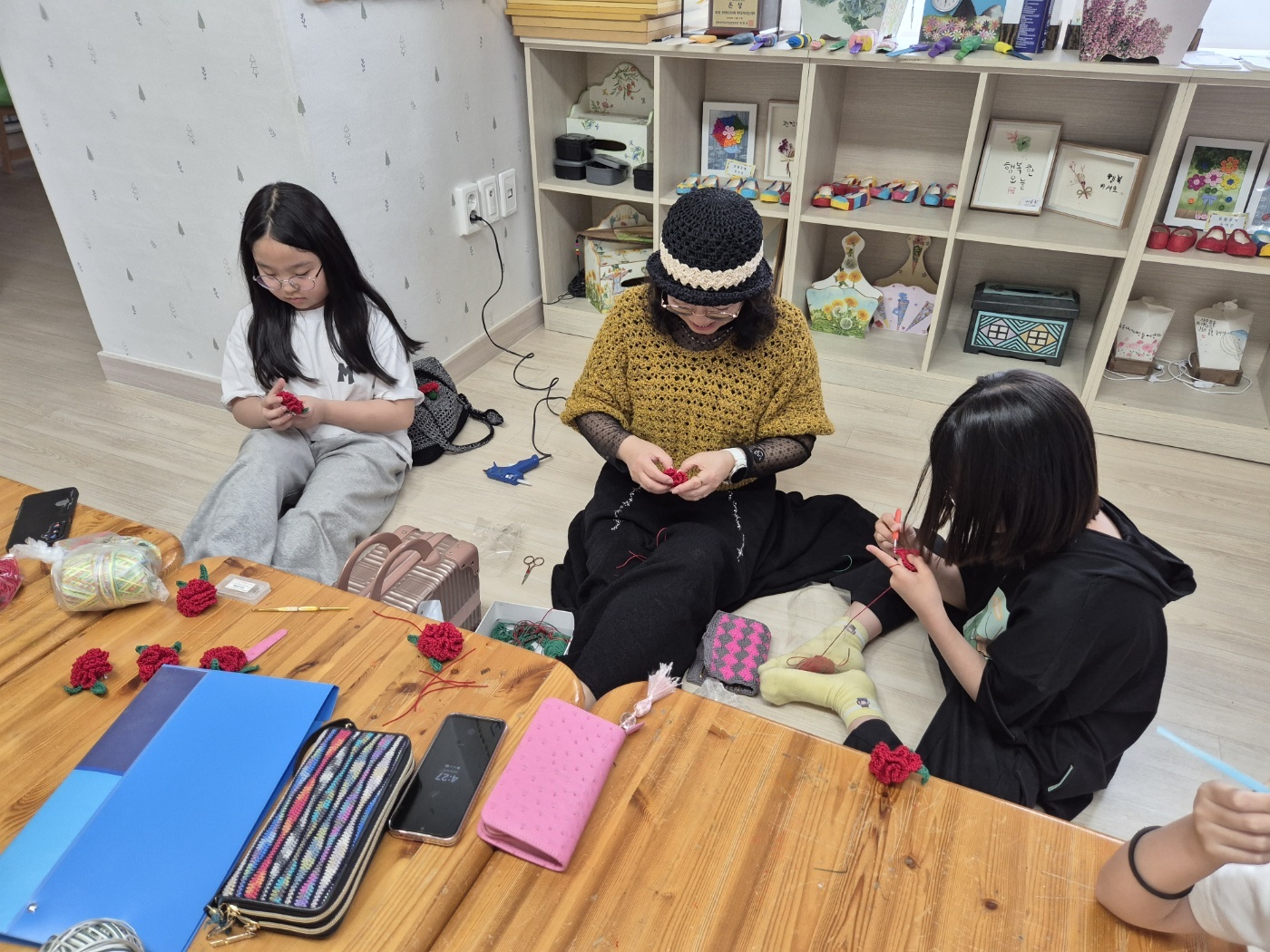 이번 시간은 카네이션 뜨기 마지막 회기로, 꽃 이파리를 떠서 붙이는 마무리 단계였다. 아동들은 지난 회기에서 만든 꽃잎을 점검하고, 교사의 시범을 보며 이파리 뜨기 방법을 주의 깊게 관찰하였다. 처음 접하는 이파리 무늬에 어려움을 느끼는 아동들도 있었으나, 옆에서 먼저 완성한 친구들이 자연스럽게 설명을 도우며 협력적인 분위기가 형성되었다. 특히 손의 힘 조절이나 코 수 세기가 익숙하지 않은 저학년 아동들에게는 교사가 개별 지도를 하며 완성을 도왔다. 대부분의 아동이 작품을 완성한 후 뿌듯해하며 “어버이날에 꼭 드릴 거예요”라고 말하는 등 성취감을 드러냈다. 수업 후에는 각자의 작품을 감상하며 서로의 결과물에 대해 칭찬을 주고받는 긍정적인 분위기로 마무리되었다.