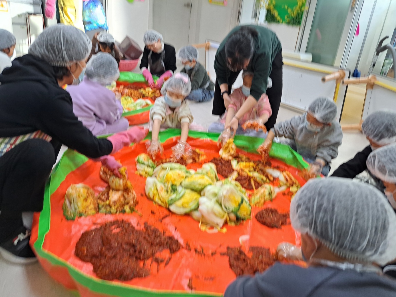 본격적인 김장 체험에서 아동들은 절인 배추에 양념을 채우는 '배추 옷 입히기' 활동에 높은 몰입도를 보였다. 대부분의 아동이 양념의 양을 조절하며 배추 속까지 꼼꼼하게 바르는 기초 실습 과정을 성공적으로 수행하였다. 양념이 손에 묻자 "내 손이 빨개졌어요!"라고 외치며 즐거워하였고, 양념통을 친구와 건네주며 "여기 양념 더 있어!", "같이 만들자!"라고 말하는 등 협동심이 자연스럽게 발휘되었다.
