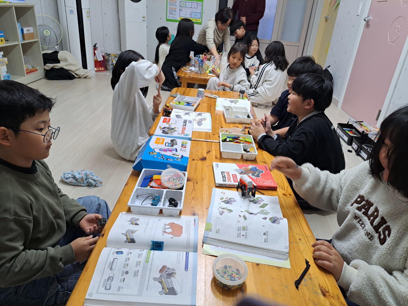 아동들은 교재를 참고하여 순서에 맞추어 조립을 진행하였고, 감속모터 및 접촉센서의 방향 등 세부 요소를 스스로 점검하며 안정적인 조립에 노력하였다. 조립 과정에서 케이블 정리 및 부품 간 간섭을 고려하는 등 체계적인 작업 습관도 확인되었다. 완성하지 못한 로봇은 파손 방지를 위해 개별 보관하도록 지도하였다.