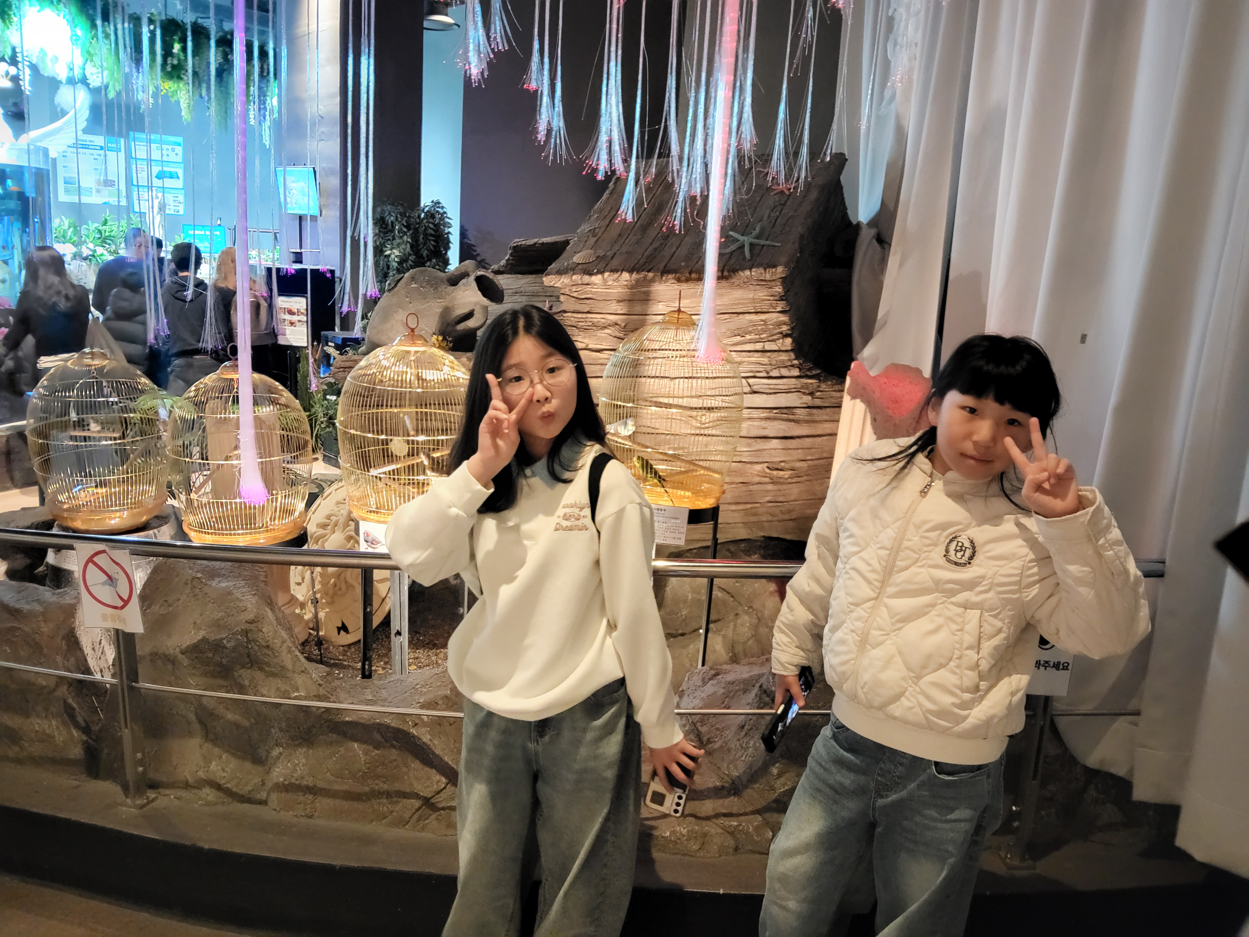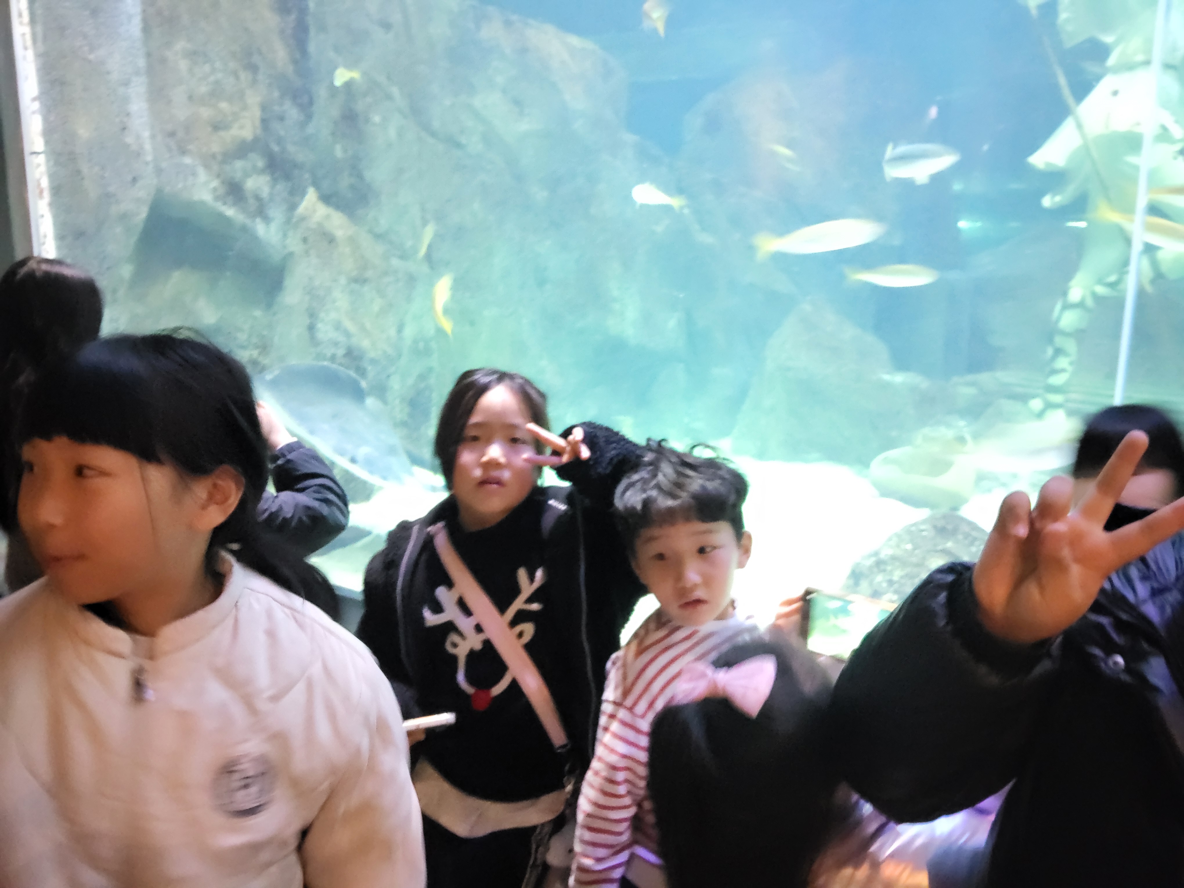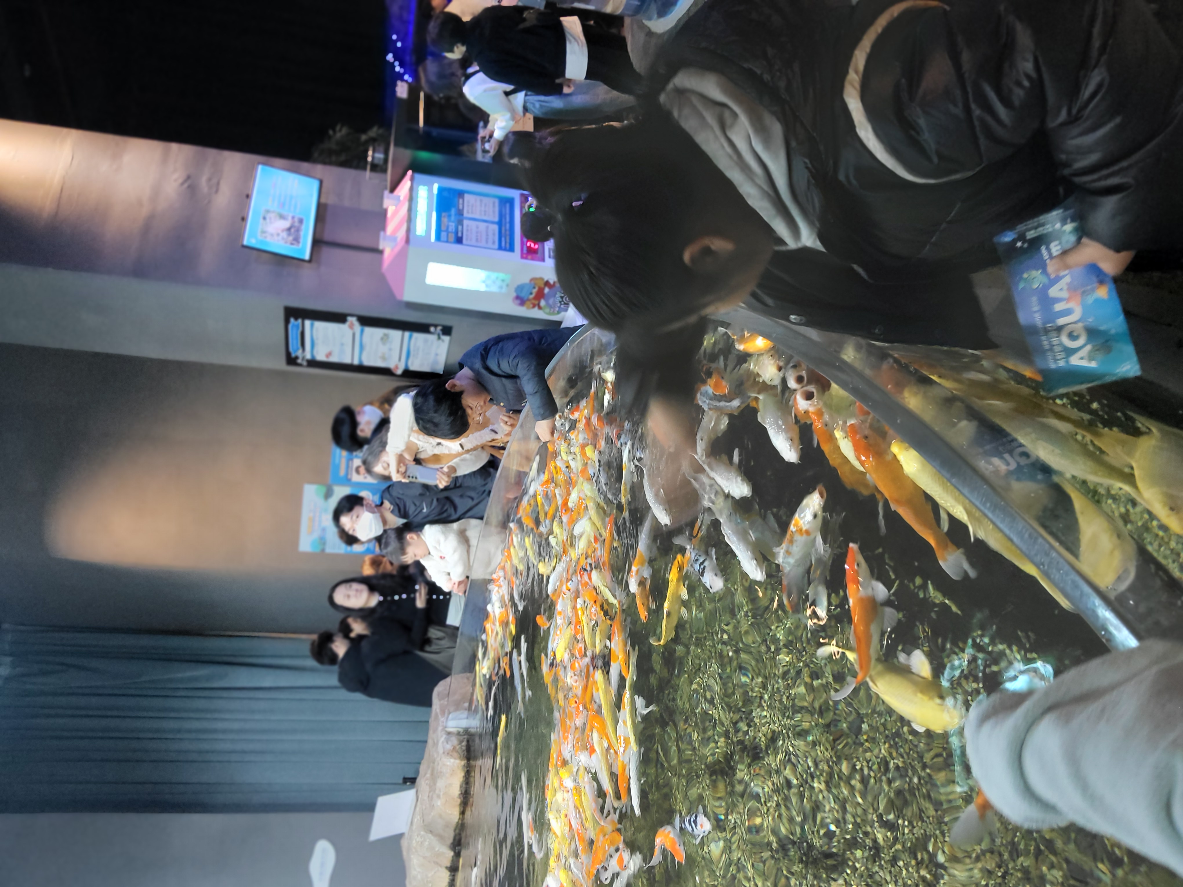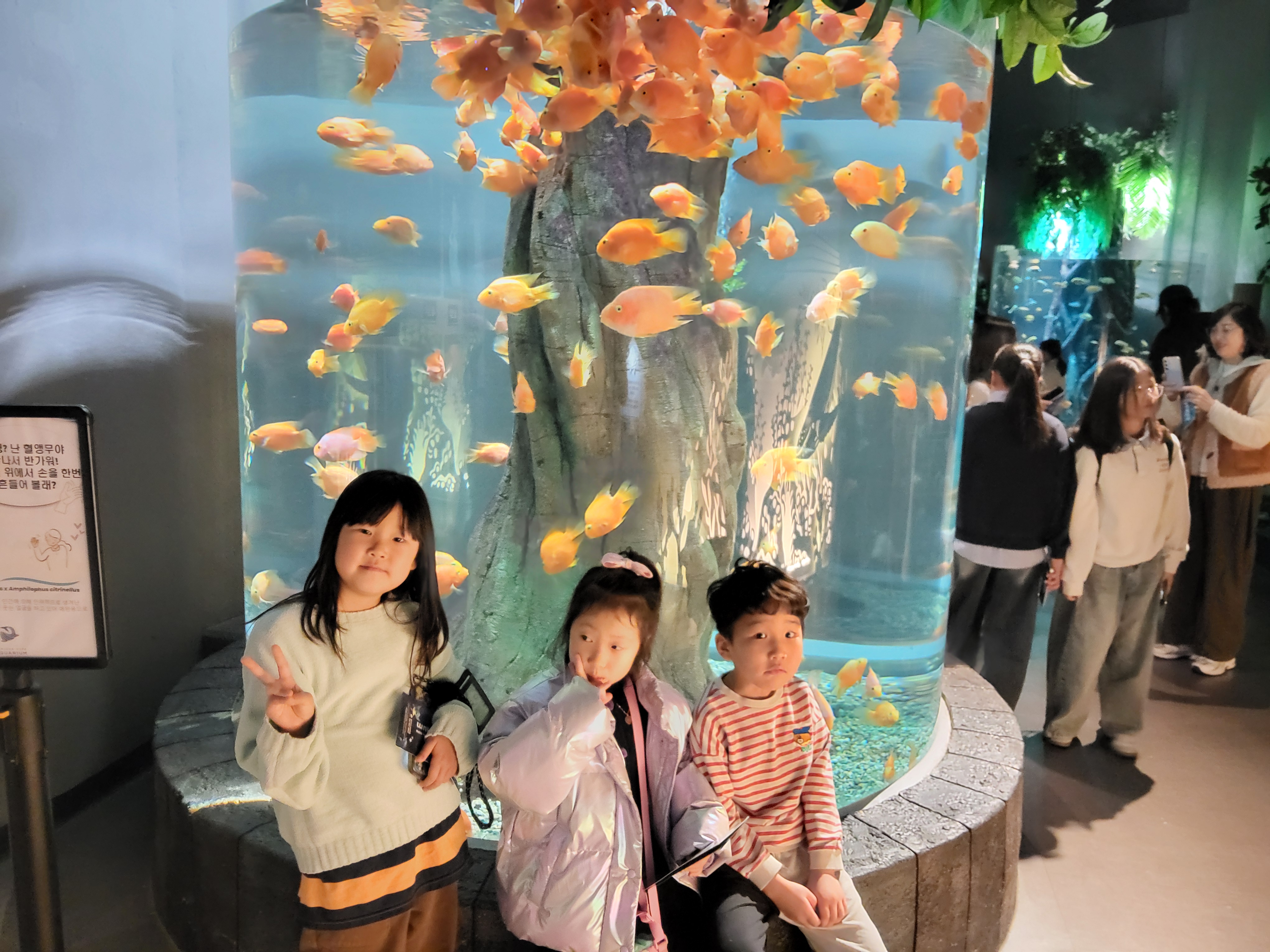 식사 후 아쿠아리움에 도착하여 본격적인 체험활동을 진행하였다. 먼저 피딩 공연(물고기 먹이 주기 공연)을 관람하였다. 대형 수조 속 다양한 어종이 먹이를 먹는 장면이 펼쳐지자 아동들은 감탄사를 연발하며 높은 관심을 보였다. 일부 아동은 “왜 큰 물고기가 더 빨라요?”, “상어는 무엇을 먹어요?” 등 생태와 관련된 질문을 적극적으로 하였으며, 해양생물에 대한 호기심이 자연스럽게 확장되는 모습을 보였다.