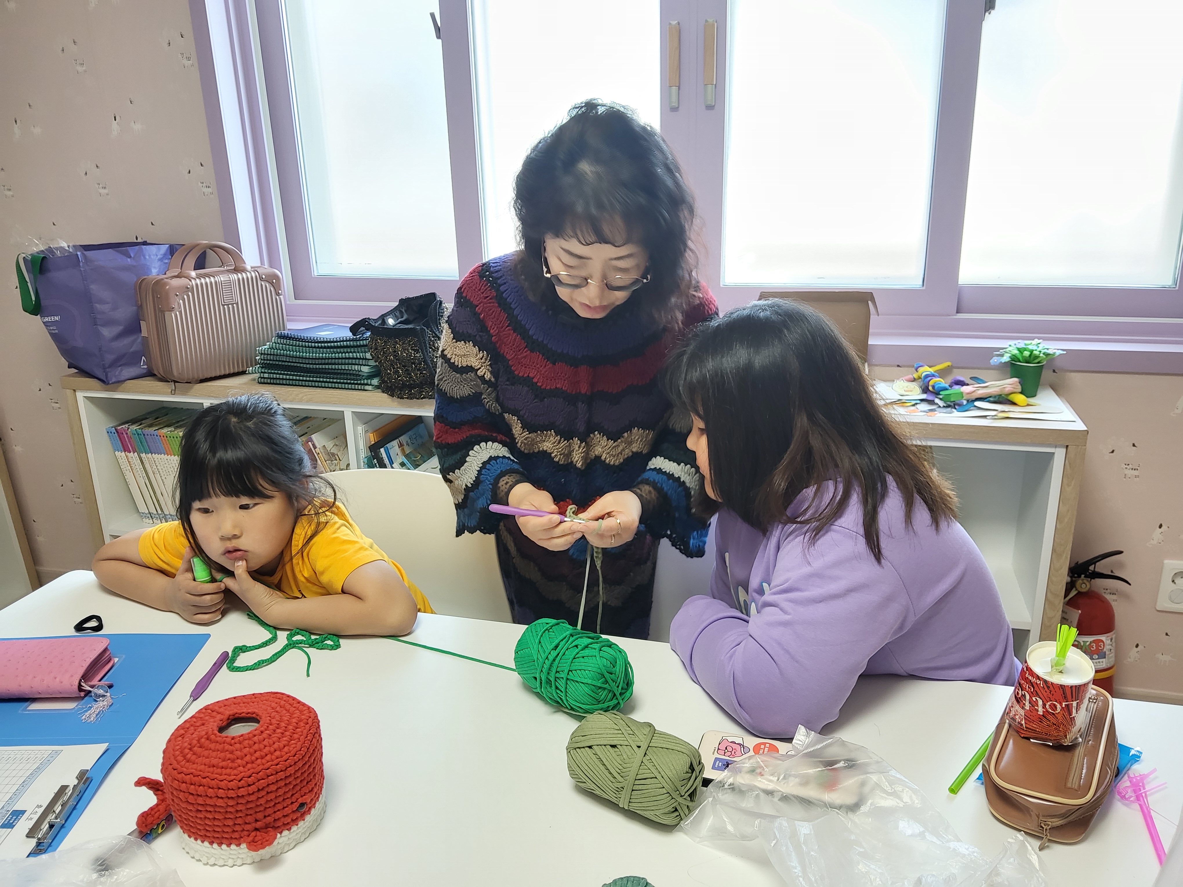 몇몇 아동들은 “이거 왜 자꾸 빠져요”, “너무 어려워요”라고 말하며 실을 놓치거나 코를 빠뜨리는 모습을 보였으며, 일부 아동은 몇 번 시도하다가 손을 멈추거나 주변을 살피는 등 집중이 흐트러지는 모습도 나타났다.