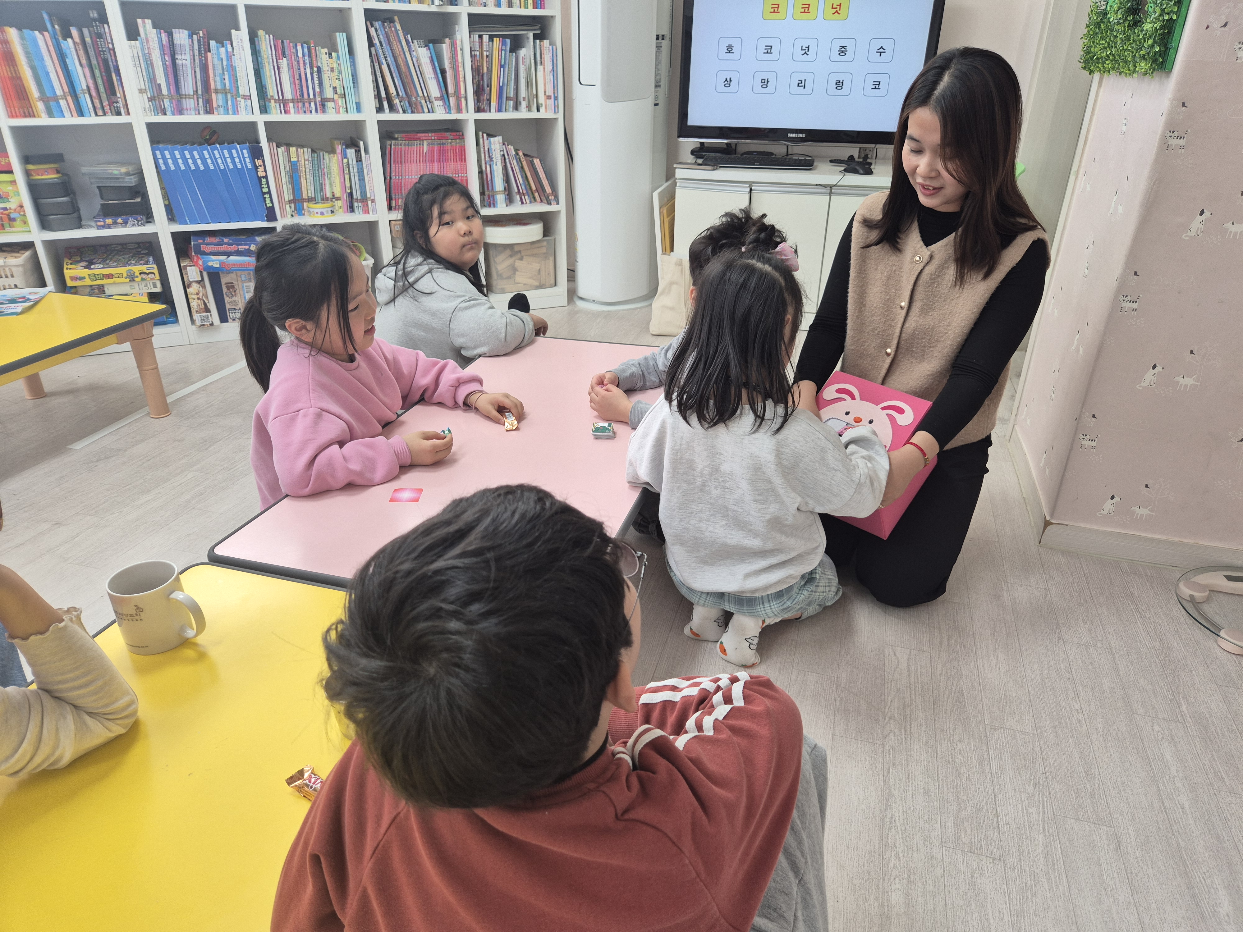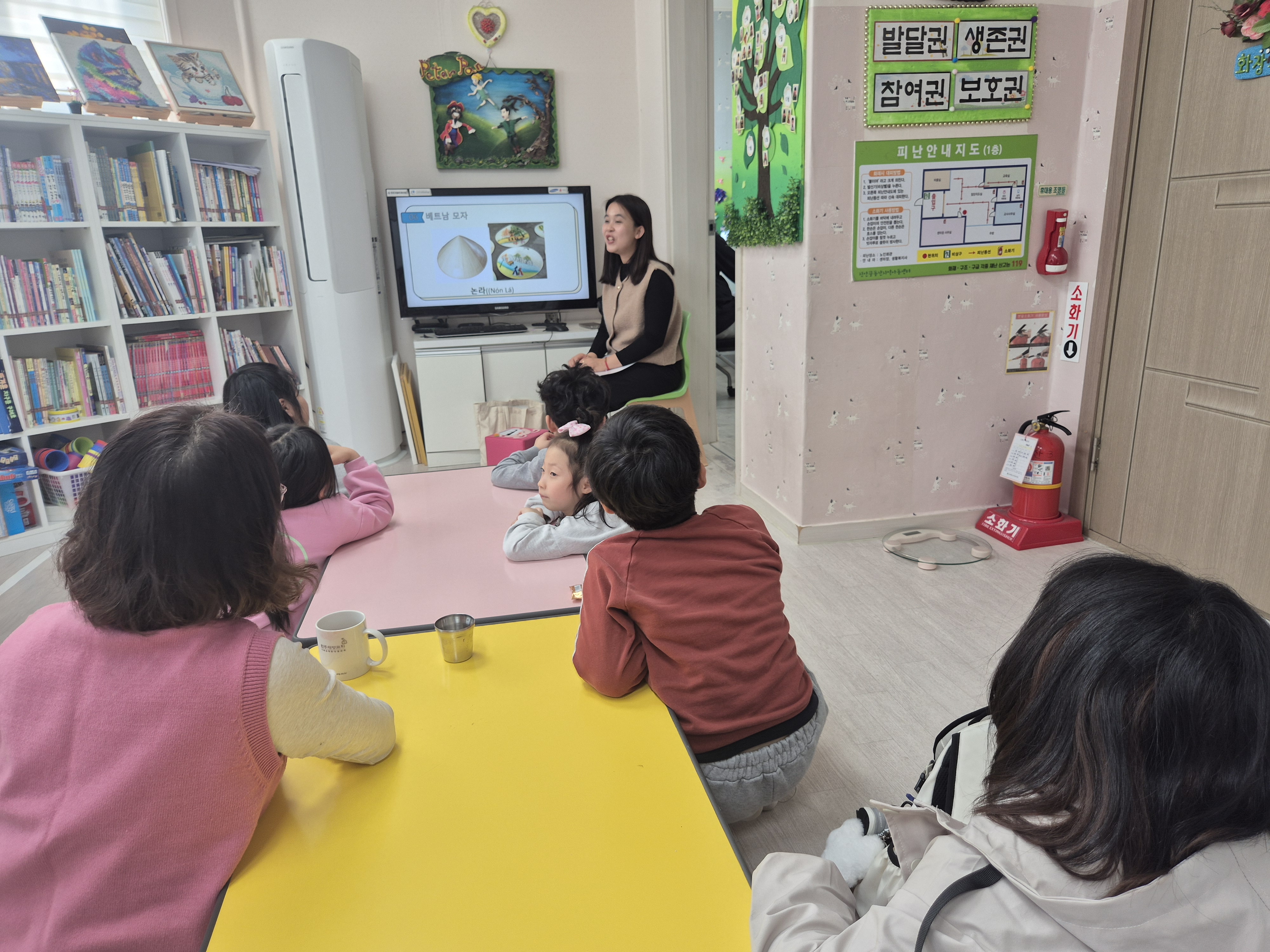 베트남어 교실의 첫 회기를 맞이하여 아이들은 시청각 자료를 활용한 수업 방식에 높은 집중력을 보이며 적극적으로 참여하였다. 특히 베트남의 자연환경과 문화를 담은 영상을 볼 때는 "우와, 저기 가보고 싶어요!", "음식이 맛있어 보여요."라고 말하며 생생한 반응을 보였다. 영상 시청 후 이어진 돌발 퀴즈 시간에는 정답을 맞히기 위해 서로 손을 번쩍 들며 "저요, 저요!"라고 외치는 등 활기찬 말투로 분위기를 주도하였다. 베트남 국기를 색칠하는 시간에도 영상에서 본 노란 별의 의미를 되새기며 정성스럽게 색을 채워 나갔으며, 영상 속 원어민의 성조를 따라 할 때는 "선생님, 말하는 게 꼭 노래 부르는 것 같아요!"라고 즐거워하며 큰 목소리로 발음을 익히는 열의를 보였다. 베트남어 및 문화 체험 프로그램의 첫 단추를 끼우는 시간으로, 영상 매체와 퀴즈를 적절히 활용하여 아이들이 타 문화에 대한 거부감 없이 즐겁게 학습을 시작한 점이 매우 고무적이다. 단순히 칠판 중심의 수업에서 벗어나 아이들이 선호하는 시각적 매체를 통해 접근함으로써 저학년 아동들까지도 끝까지 흥미를 잃지 않고 참여할 수 있었다. 아이들이 베트남어 특유의 성조를 하나의 놀이처럼 받아들이며 스펀지처럼 흡수하는 모습에서 향후 진행될 회차별 대화 수업에 대한 높은 성취도가 기대된다.