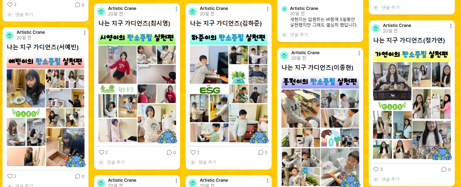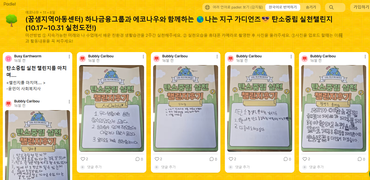 우리 꿈샘 초등학생 4~5학년 친구들이 단체부문에 참여하여 센터별 패들렛에 탄소중립 실천행동 사진을 정성스럽게 업로