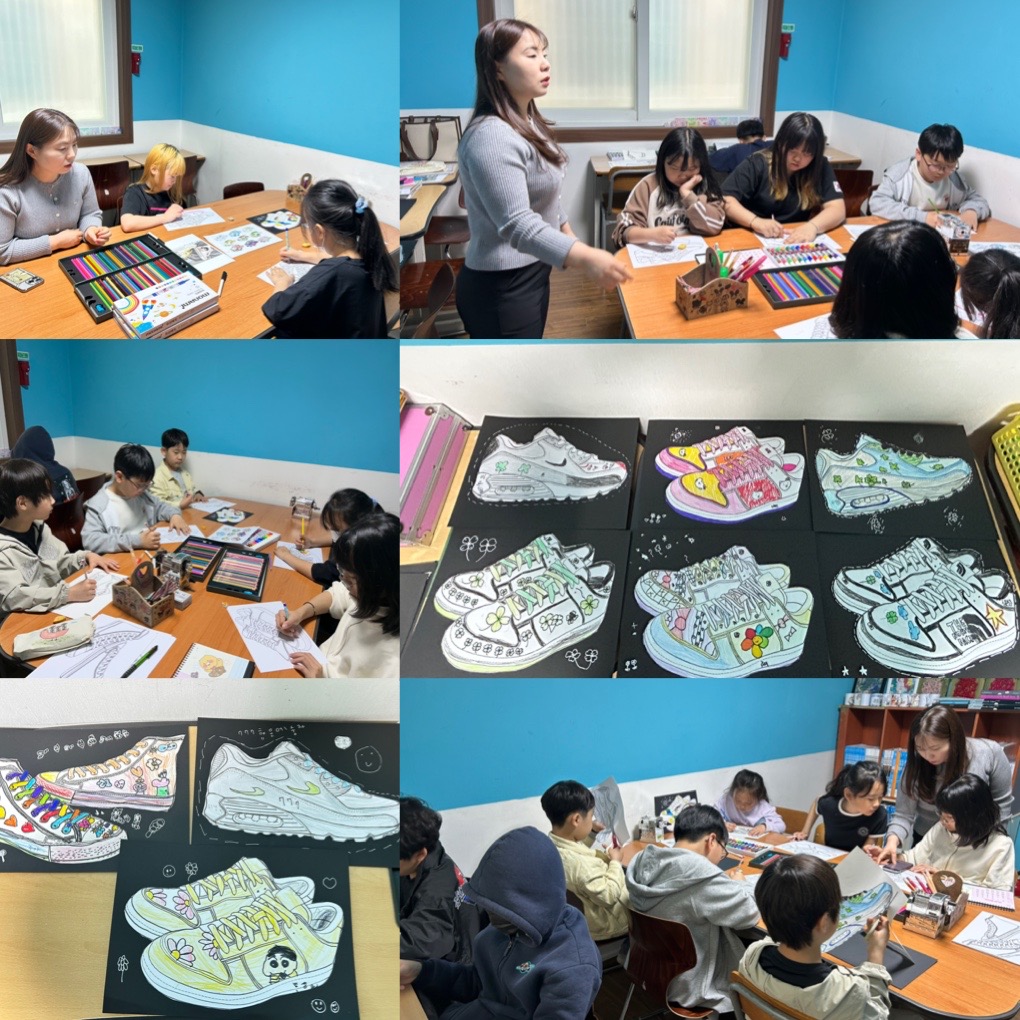 오늘은 운동화 커스텀 꾸미기 작품 활동을 해보았습니다. 자신만의 운동화 커스텀을 그려보았고, 정성스럽게 색칠하고 꾸며보며