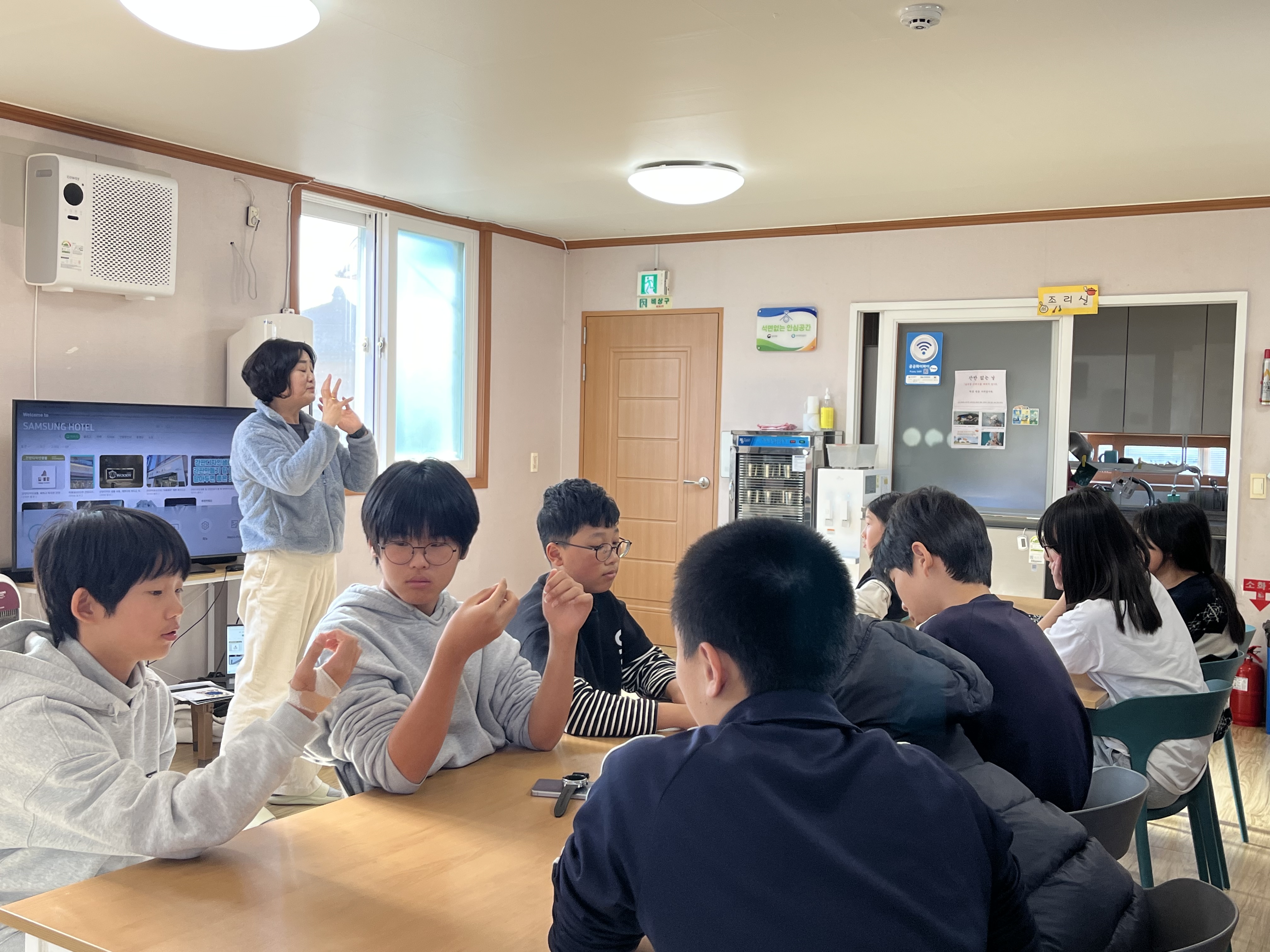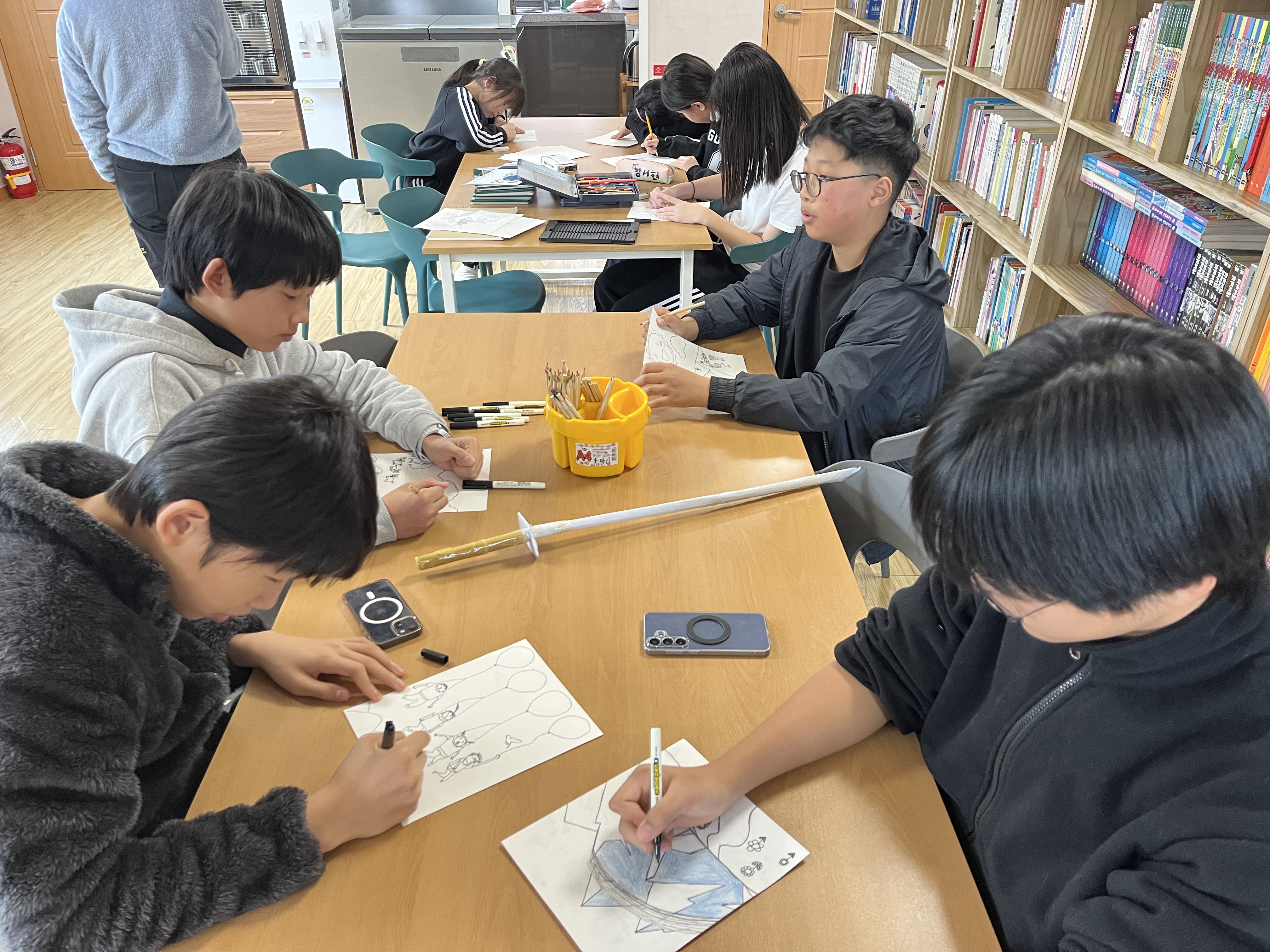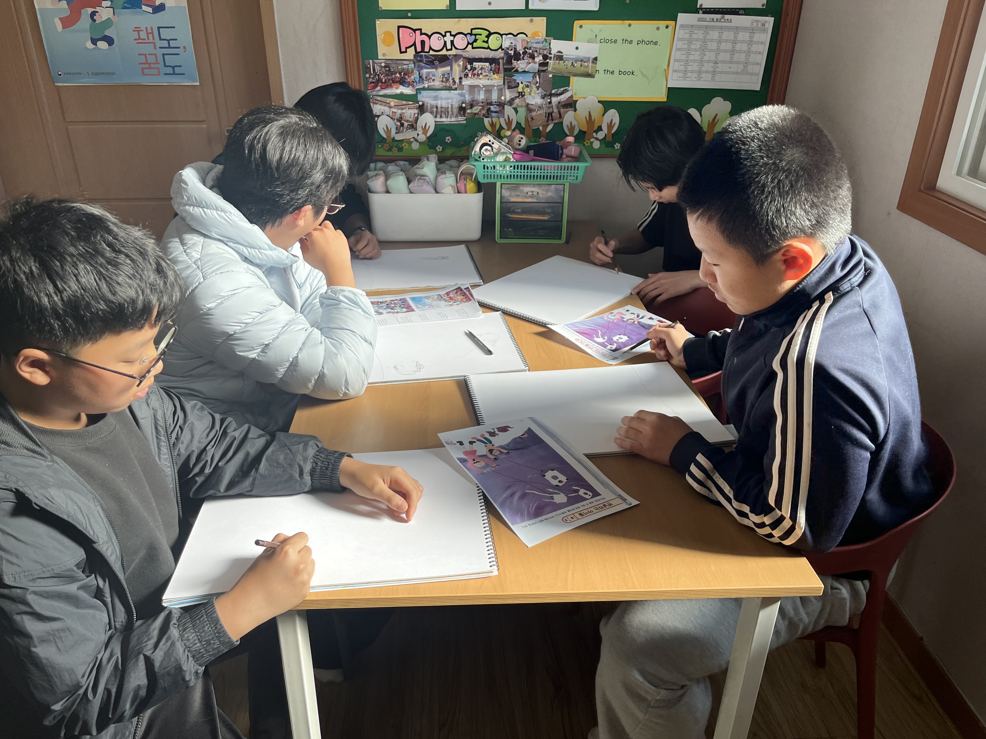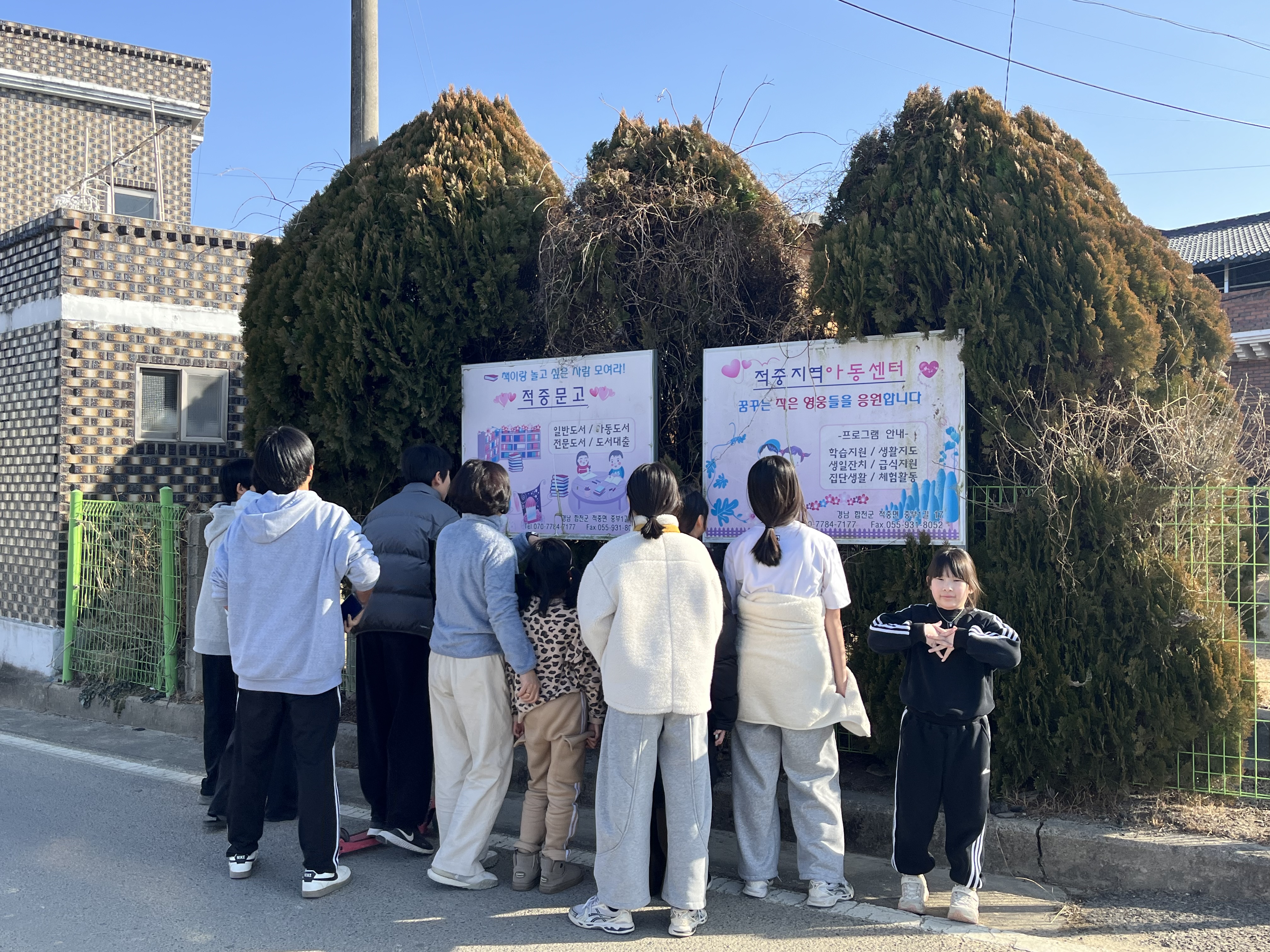 미술 수업 간판 제작 활동을 하고 있는 아동들의 모습입니다. 적중지역아동센터의 간판을 아동들의 아이디어로 제작합니다.