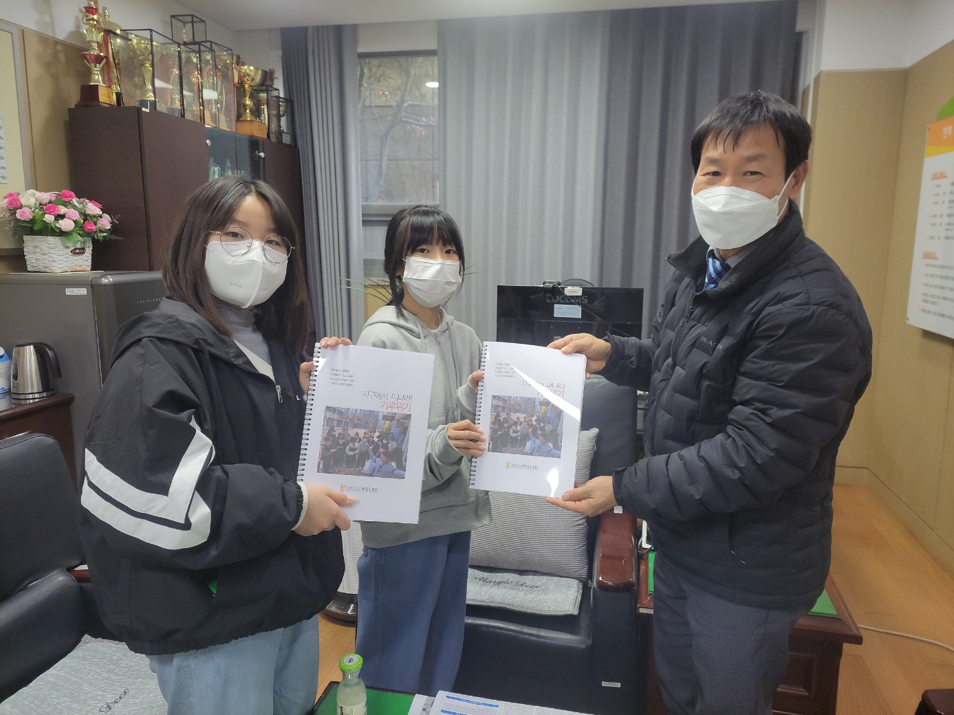 아동들이 만든 활동지를 바탕으로 책을 만들었고 그 책을 근처 행정복지센터에 가져가 동장님께 전달하며 동장님께서도 기후 변화가 주는 위험에 대해 다시 한 번 생각해보는 시간이 되었다고 하셨습니다.