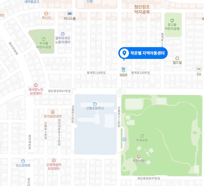 작은별지역아동센터 | 광주광역시 광산구 월계로130번길 29 1층 (월계동) [지도보기] Tel : 062-971-1625 Fax : 062-971-1626 E-mail : lstar1625@hanmail.net