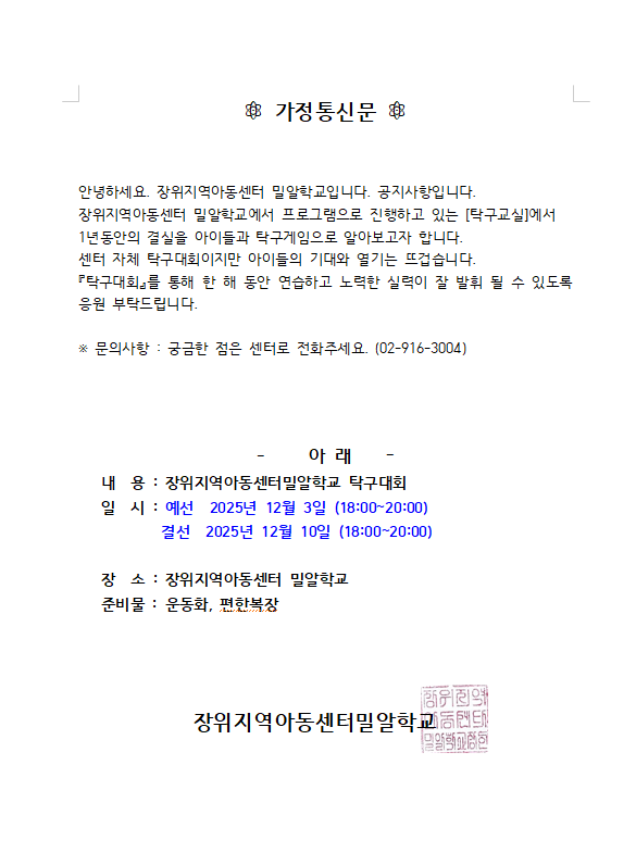장위지역아동센터밀알학교 탁구대회 가정통신문