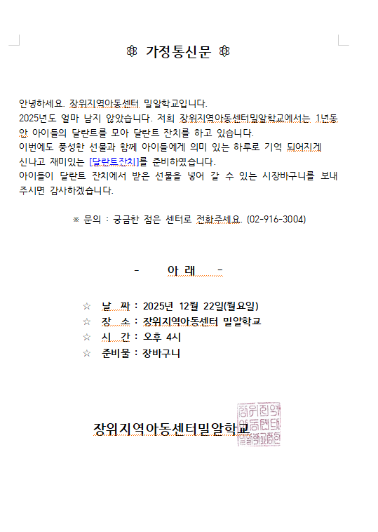 장위지역아동센터밀알학교 | 서울특별시 성북구 돌곶이로 157 장위동 한전빌딩 4층 [지도보기] Tel : 02-916-3004 Fax : 02-909-0191 E-mail : jg0191@naver.com