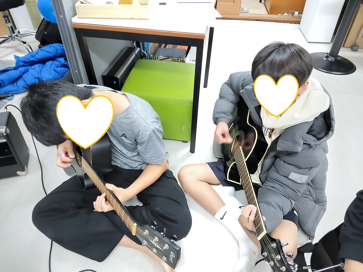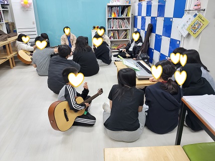 밴드수업을 하고 있다. 아이들은 먼저 어떻게 곡을 연습해야 하는지에 대한 회의와 연습시간을 좀 더 알차게 보내야 할 것에 대해 회의를 하였다.