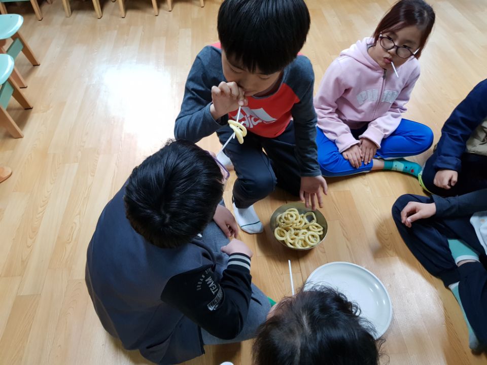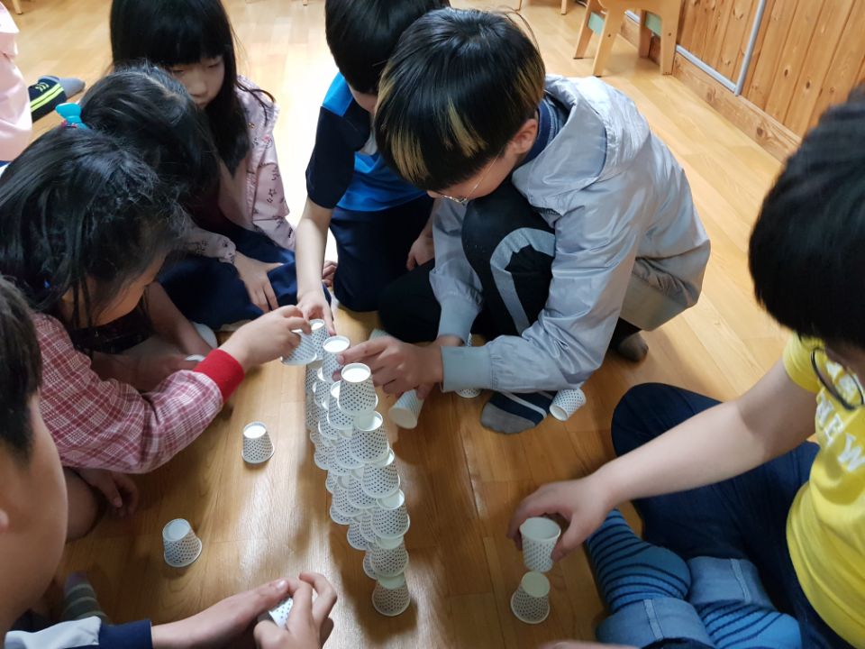 두팀으로 나누어 팀장을 정하고 종이컵을 이용해 높이 탑 쌓기, 빨대를 이용해 과자옮기기, 손안대고 과자 빨리먹기, 스피드 퀴즈 등