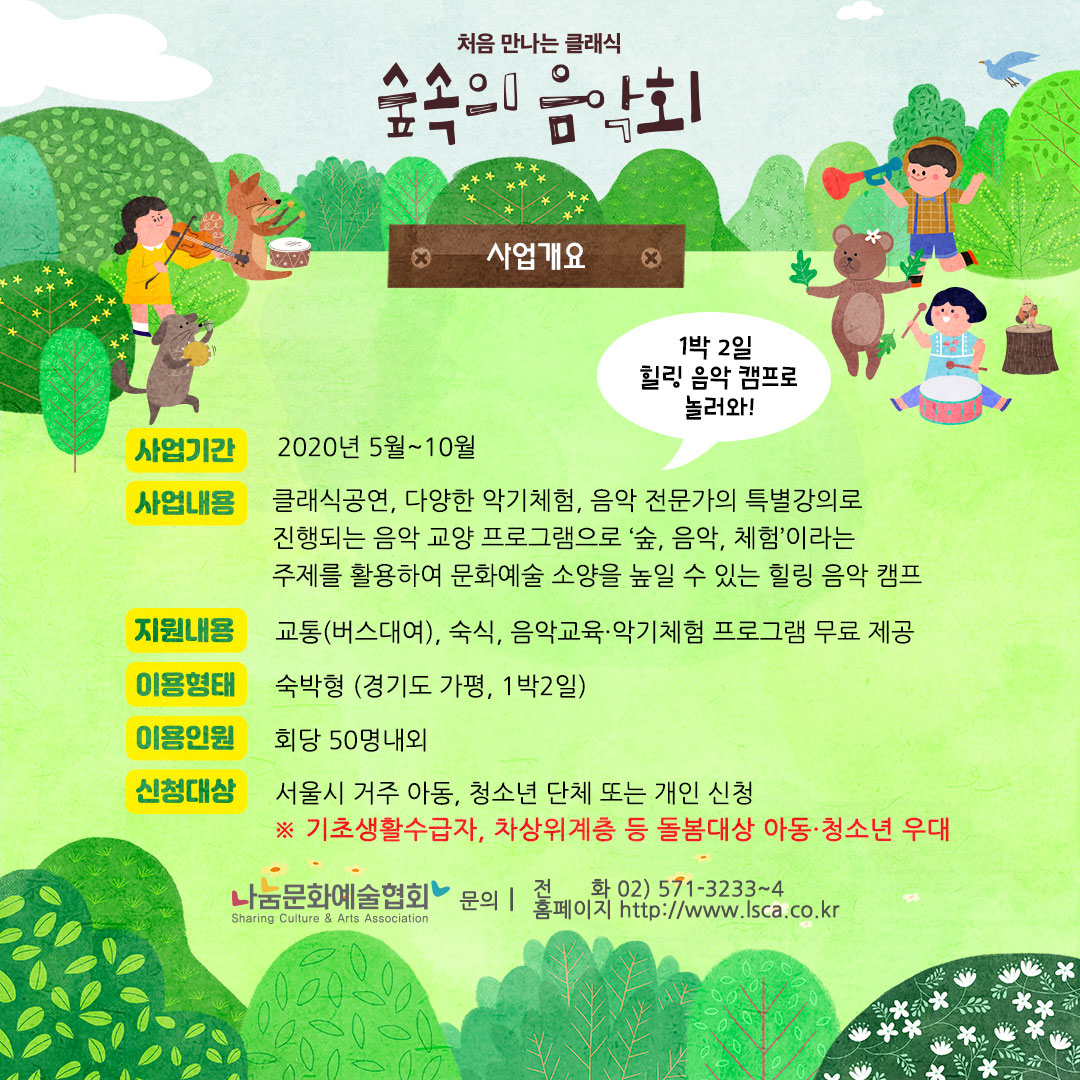 사업내용: 클래식공연, 다양한 악기체험, 음악 전문가의 특별강의로 진행되는 음악 교양 프로그램으로 '숲,음악,체험'이라는 주제를 활용하여 문화예술 소양을 높일 수 있는 힐링 음악 캠프