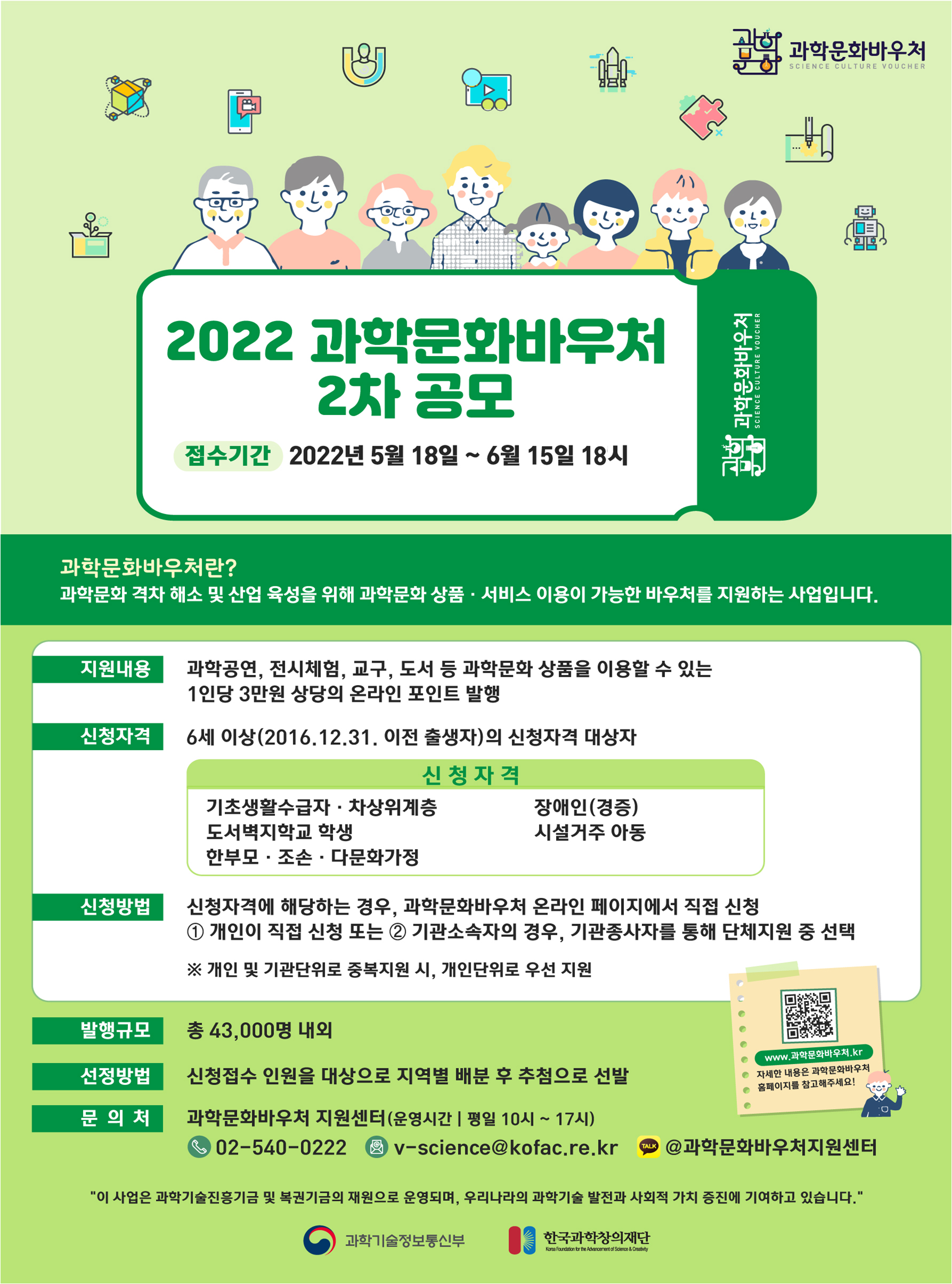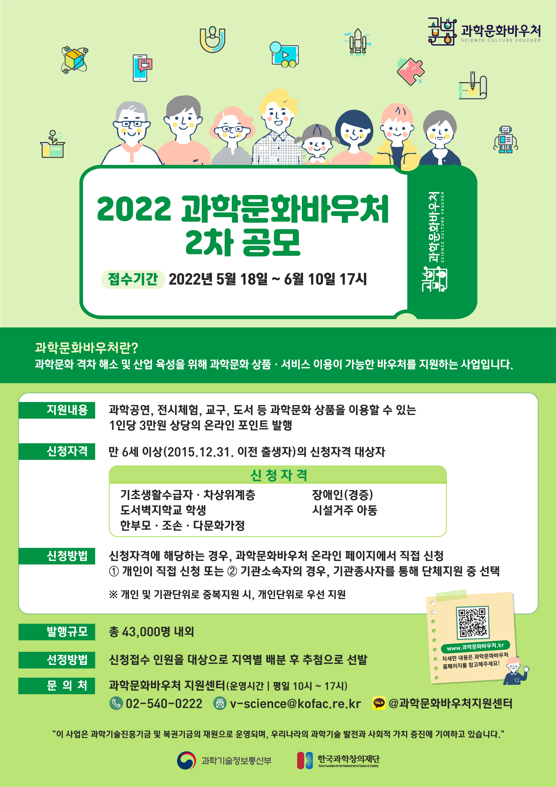 과학기술정보통신부와 한국과학창의재단은 과학문화 확산 및 격차 완화를 위해 다양한 사회배려계층을 대상으로 2022년 과학문화바우처를 지원하오니 많은 신청과 참여를 바랍니다.